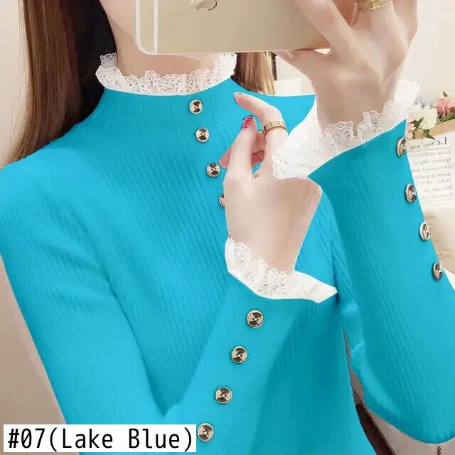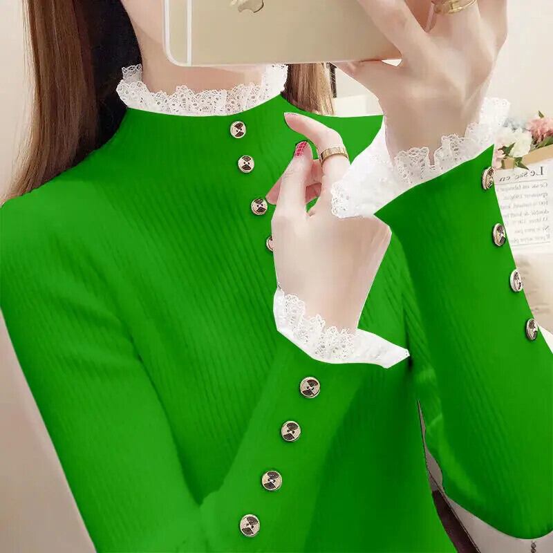 送料無料 スタイリッシュなハーフカラーニットボタンスプライシングルーズレースセーター女性の 2022 秋プルオーバー暖かいトップス オータム 秋物 AE128877665662530192