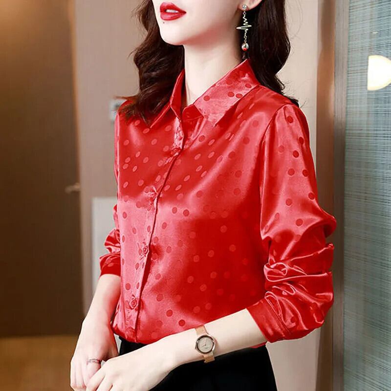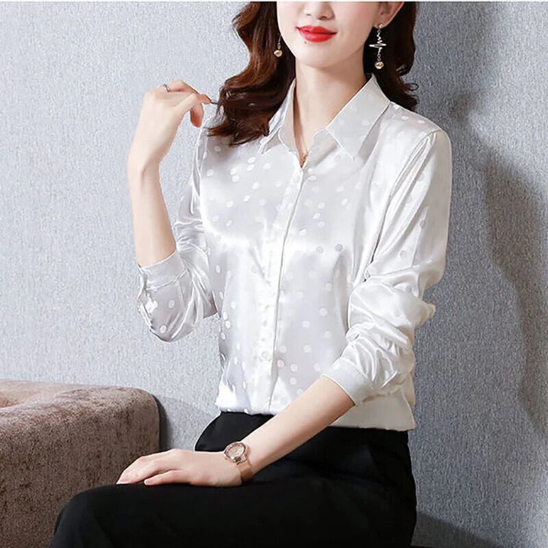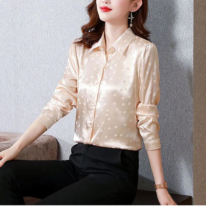 送料無料 プリントスプライスボタン水玉サテンシャツ女性の 2023 秋トップスオールマッチオフィスレディブラウス オータム 秋物 会社 学校 通勤や通学にも AE128877662875580611
