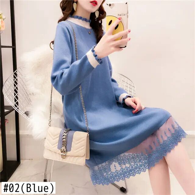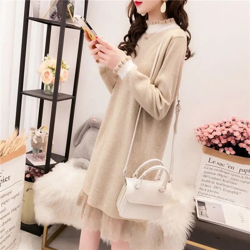 送料無料 スタンドカラーフリルスプライシングレースドレスレディース2024春ニットオールマッチドレス ラッフル スプリング 春物 AE1288776649382145134
