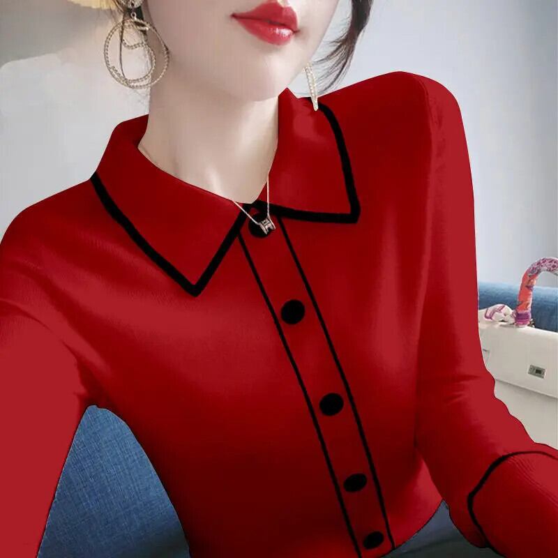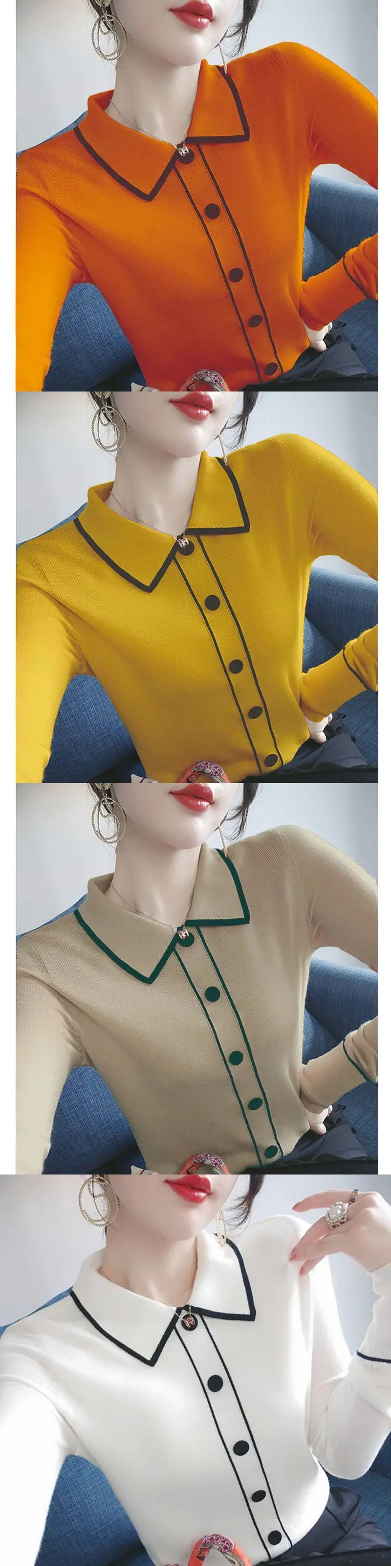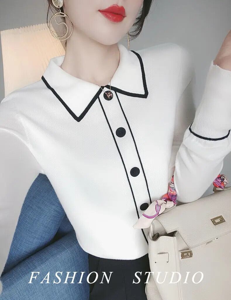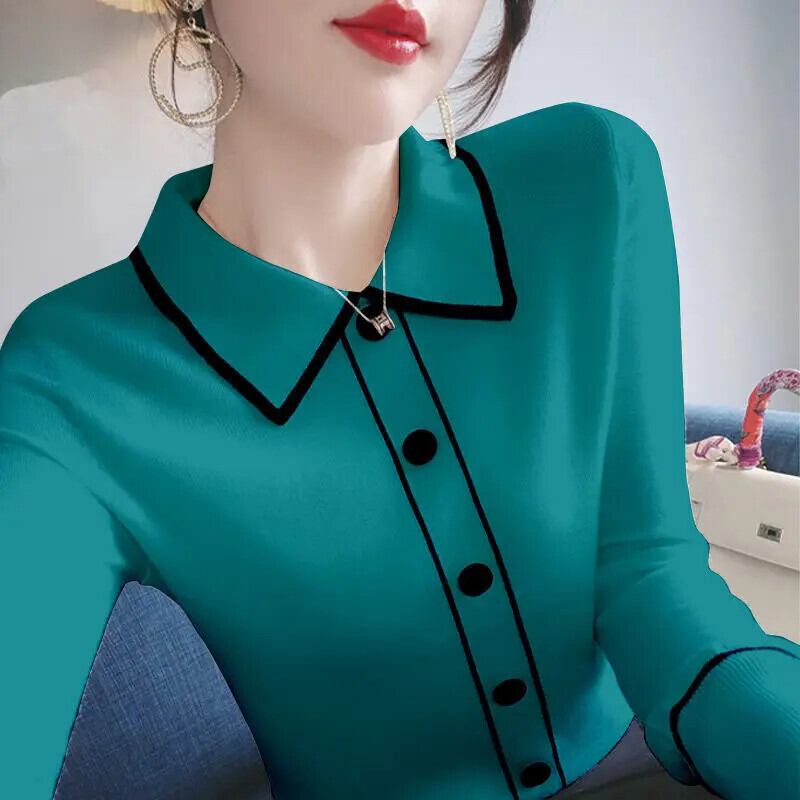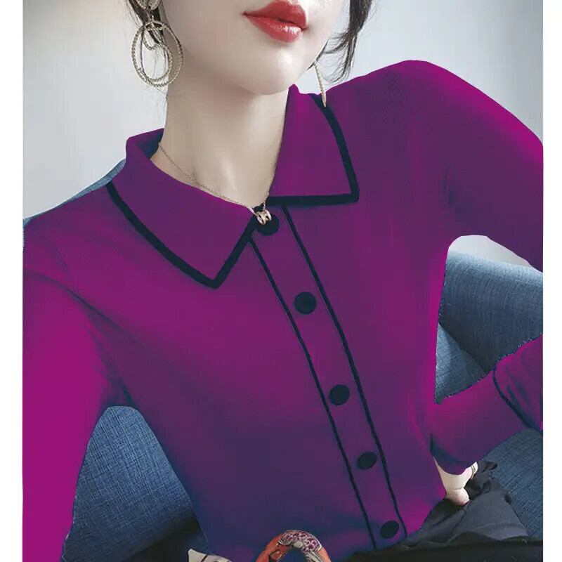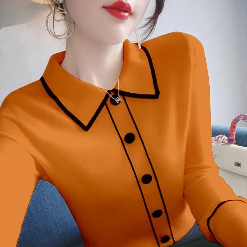 送料無料 ラペルスプライスボタンオールマッチニットブラウス女性の 2022 秋プルオーバールーズオフィスレディシャツ オータム 秋物 会社 学校 通勤や通学にも AE1288776620627046536