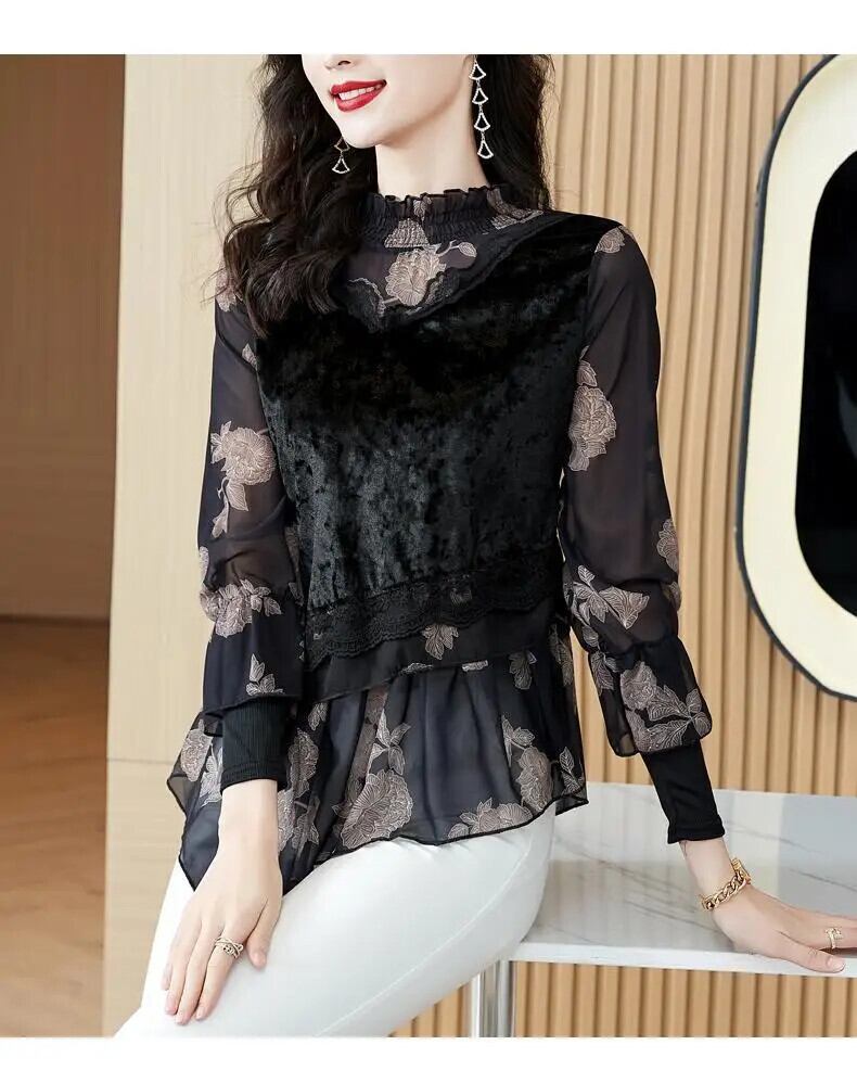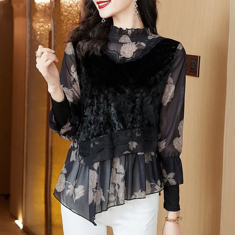 送料無料 フリルネックレース花柄フェイクツーピースブラウス女性の 2023 秋特大トップス不規則なシャツ オータム 秋物 AE1288776682422994308