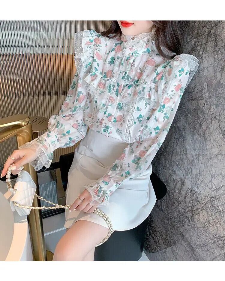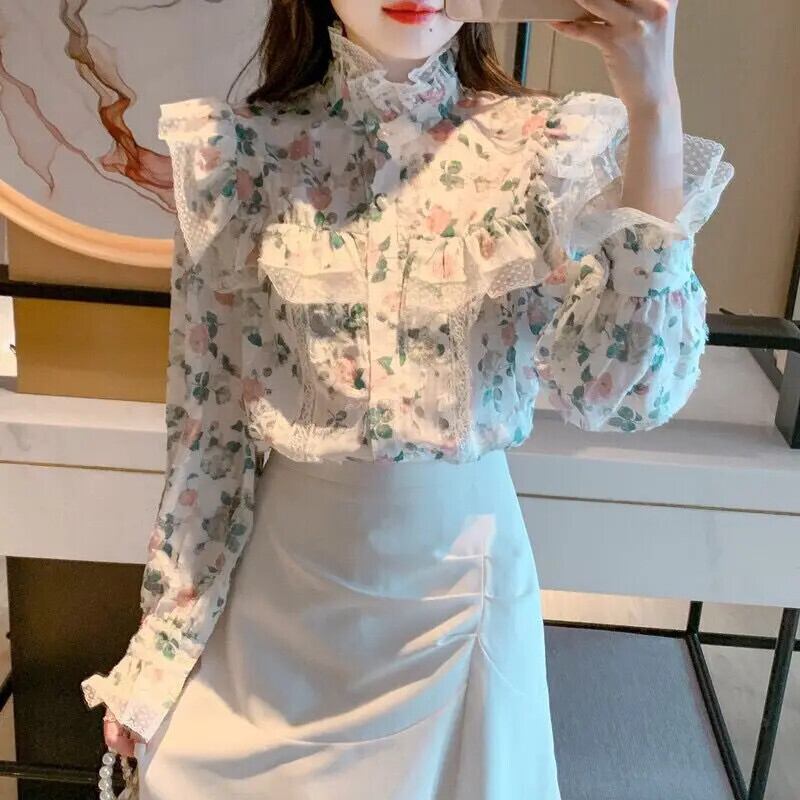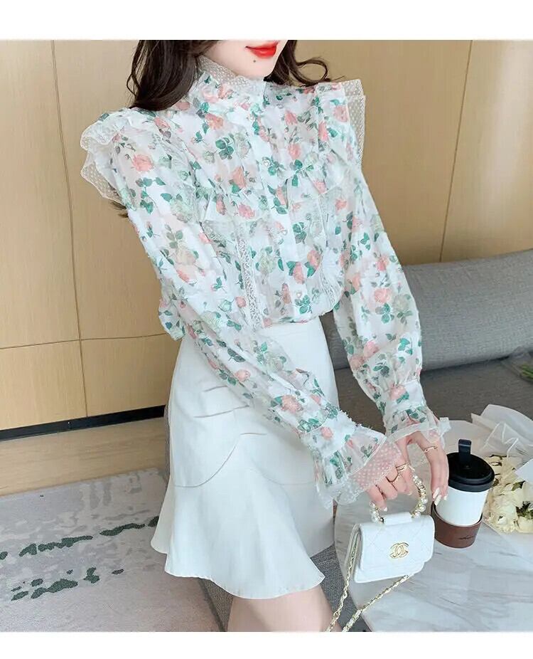 送料無料 ヴィンテージプリントガーゼ花柄フレアスリーブシフォンシャツ女性の 2023 秋冬トップス甘いブラウス 大人ガーリー スウィート キュート カジュアル オータム 秋物 ウィンター 冬物 ビンテージ AE1288776631813910761