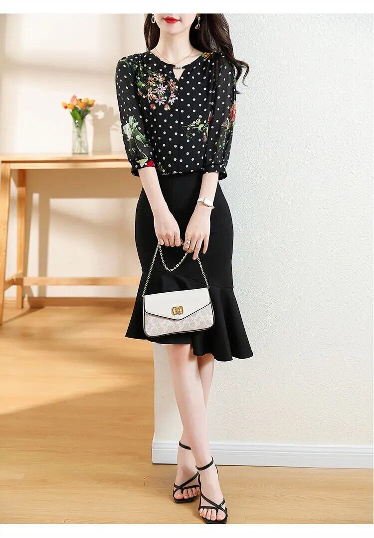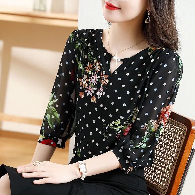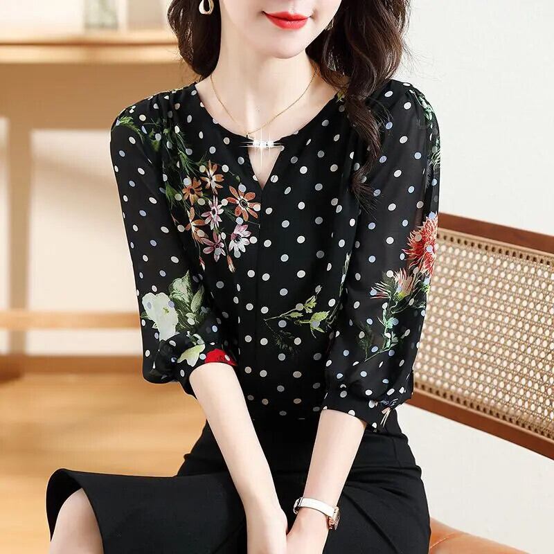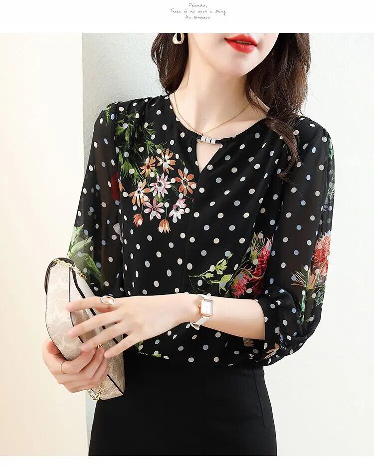 送料無料 プリントダイヤモンドポルカドット花柄シフォンブラウス女性の 2023 秋特大トップス通勤シャツ オータム 秋物 AE128877666082320317