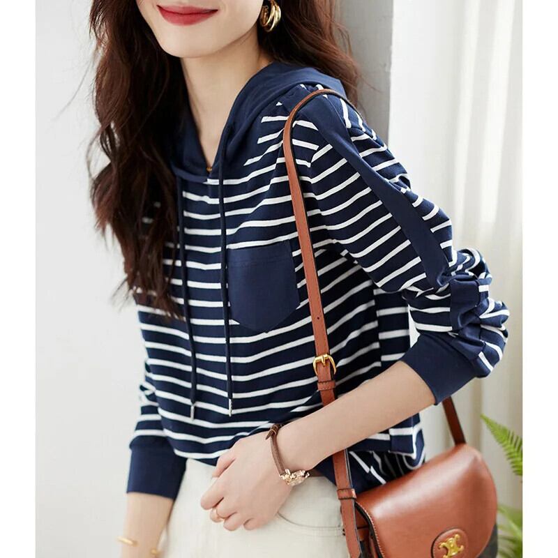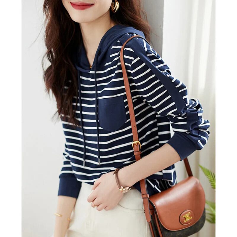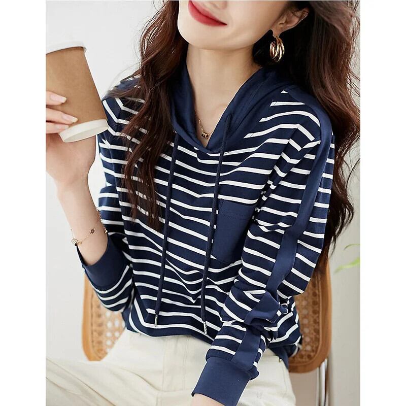 送料無料 フード付きスプライシングルーズポケットストライプブラウス2023秋プルオーバーオールマッチ通勤シャツ オータム 秋物 AE1288776642468025581