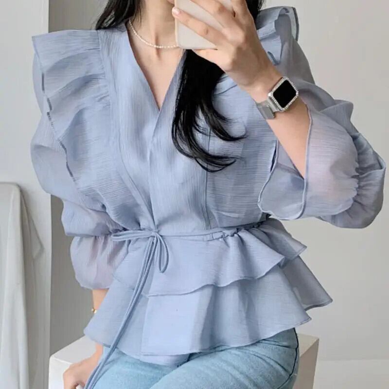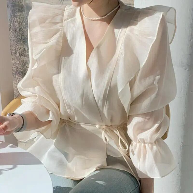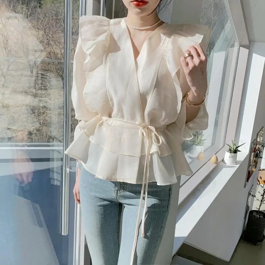 送料無料 V ネックフリルレースアップリボン不規則なフレアスリーブシャツ女性の 2023 夏トップスルーズスイートブラウス ラッフル 大人ガーリー スウィート キュート カジュアル サマー 夏物 Vネック AE1288776635776712450