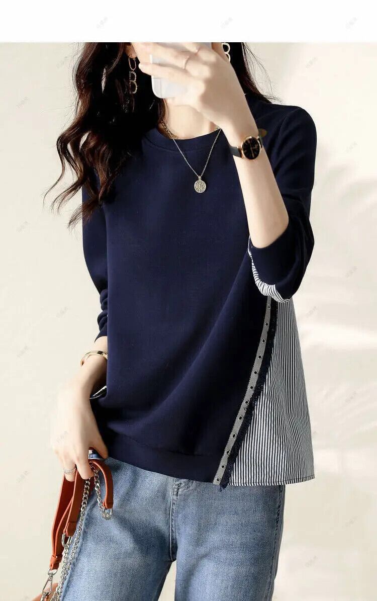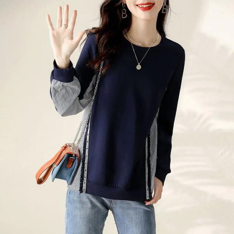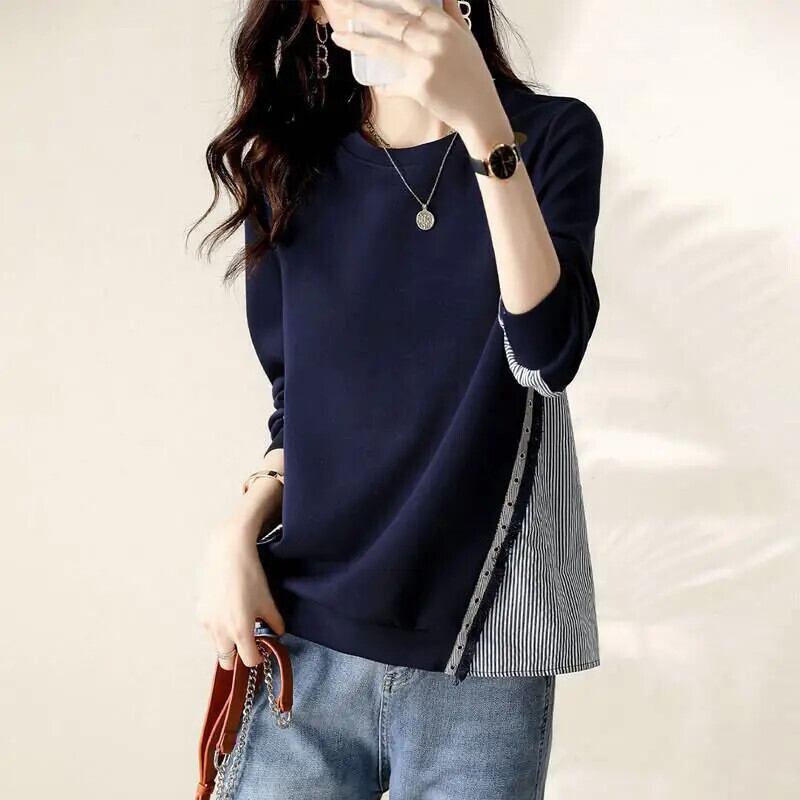 送料無料 プリントスプライスフェイクツーピースストライプブラウス2022秋通勤トップスオールマッチシャツ オータム 秋物 AE128877663609278080