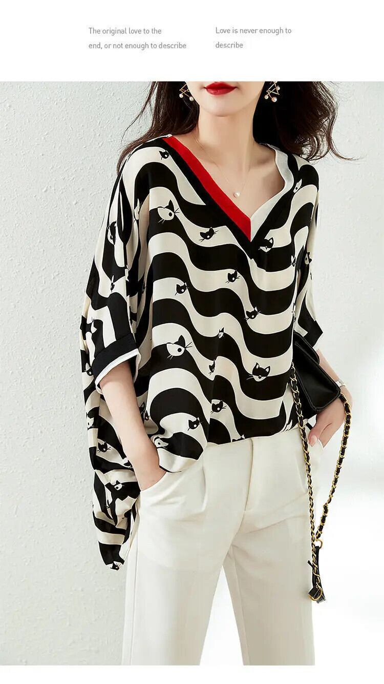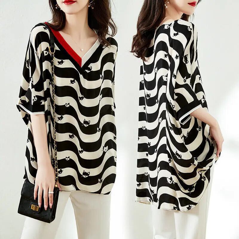 送料無料 V ネックスプライスプリントストライプ特大バットウィングスリーブブラウス 2022 夏の女性のルーズ通勤シャツ サマー 夏物 Vネック AE12887766702653302