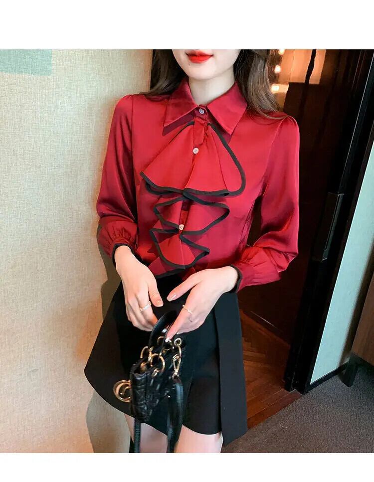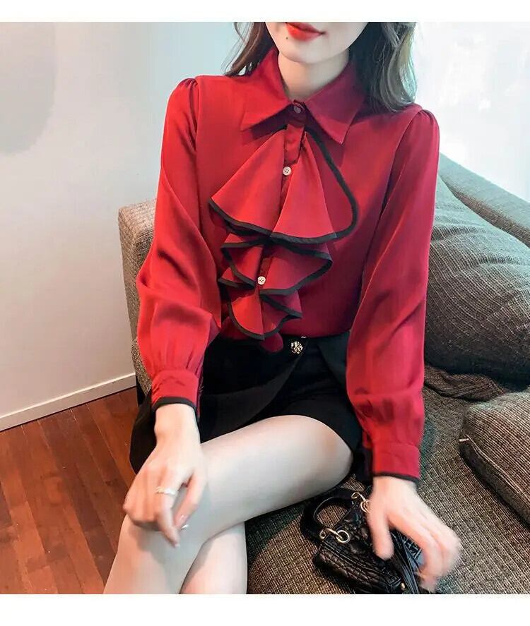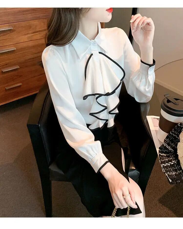 送料無料 ラペルスプライスボタンフリルシフォンシャツ女性の 2023 秋冬トップスオフィスレディブラウス ラッフル オータム 秋物 ウィンター 冬物 会社 学校 通勤や通学にも AE128877668679986436