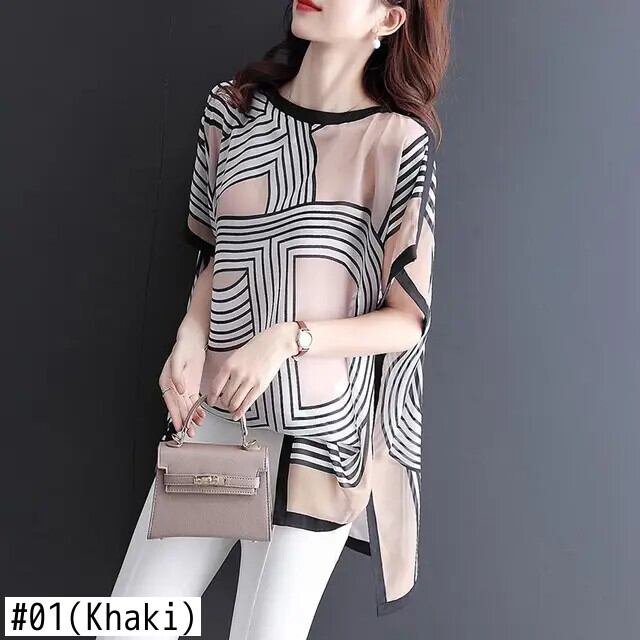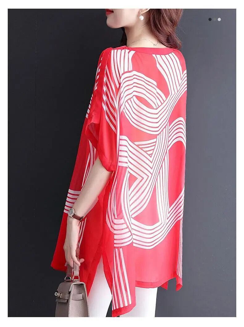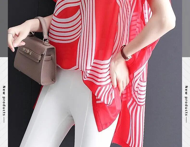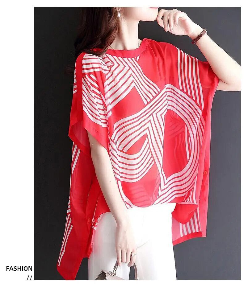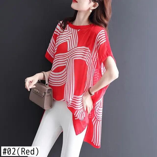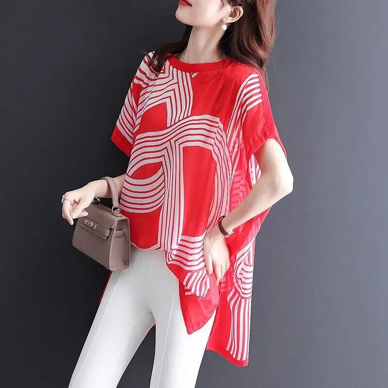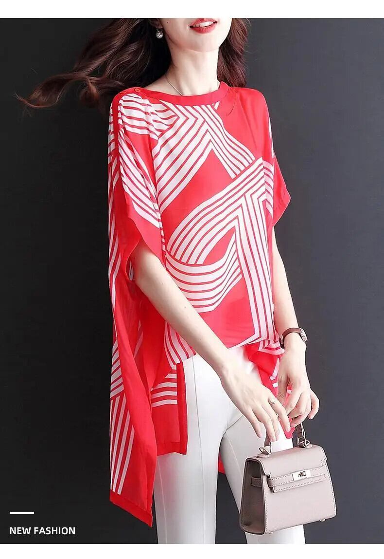 送料無料 ストライププリントバットウィングスリーブ特大ルーズ不規則なシフォンシャツ夏の非対称女性ブラウス サマー 夏物 AE1288776633202329729