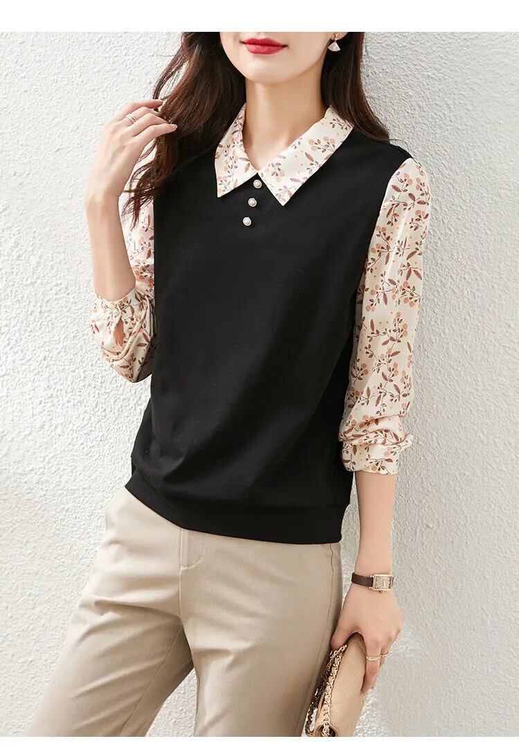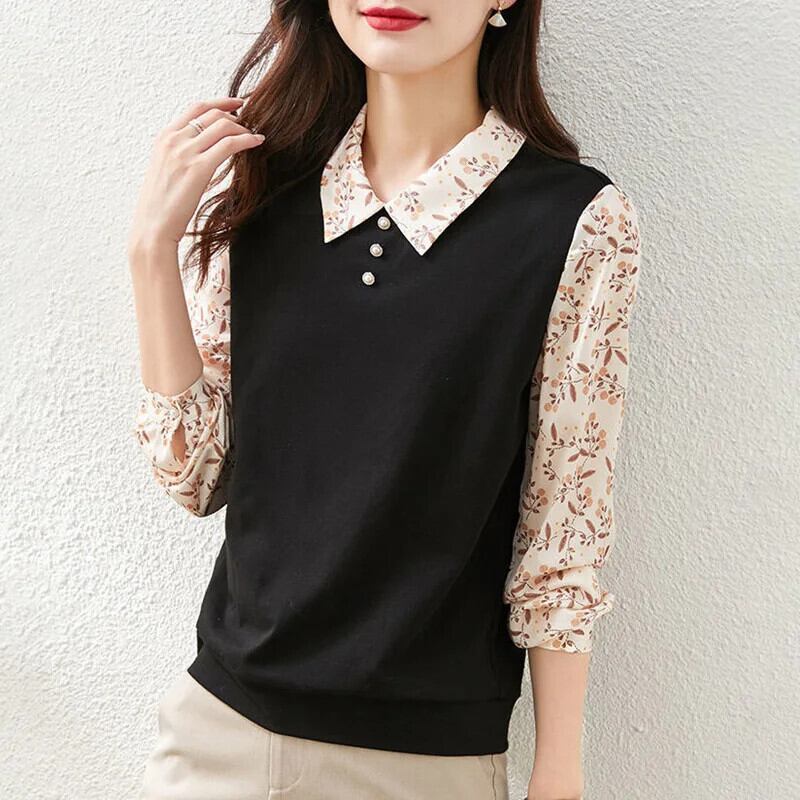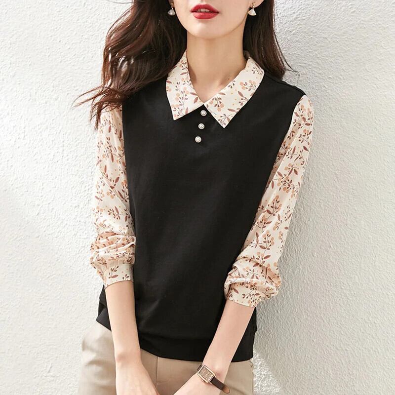 送料無料 ラペルボタンスプライシングプリント偽二枚ブラウス女性 2022 秋プルオーバートップスルーズシャツ オータム 秋物 AE1288776640171275910