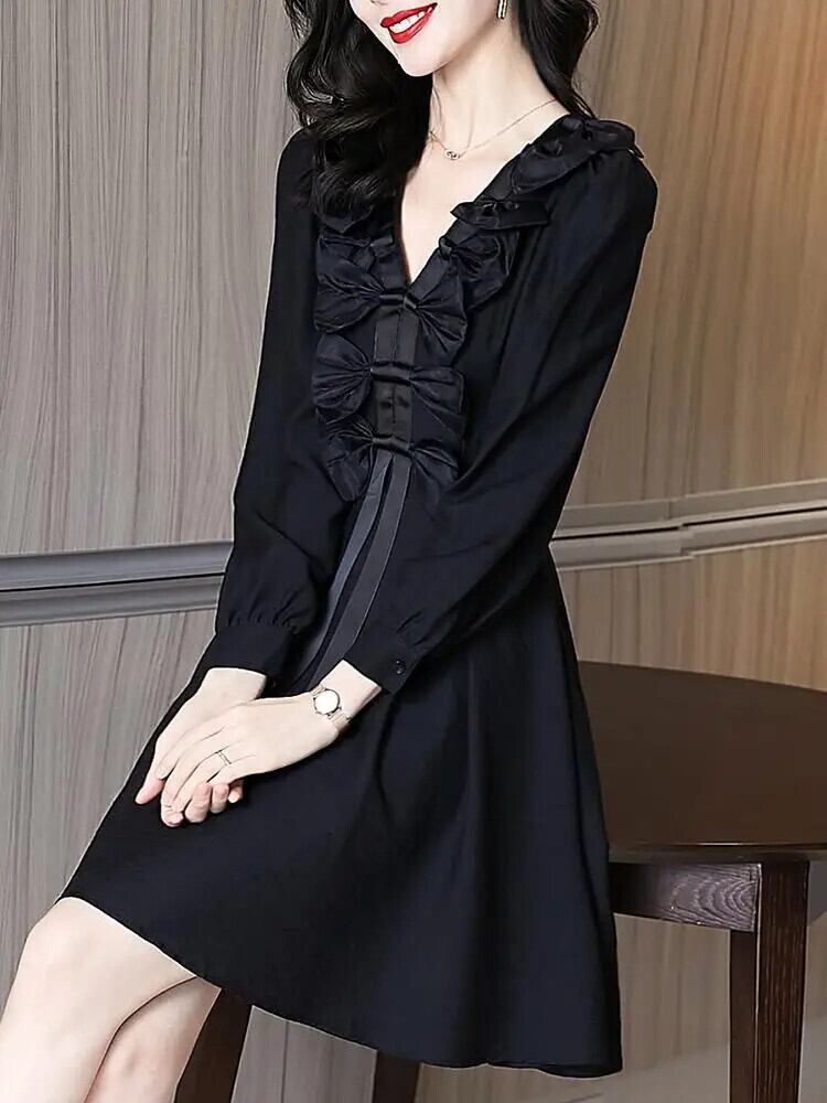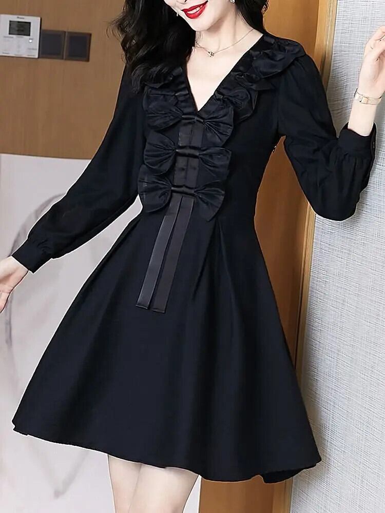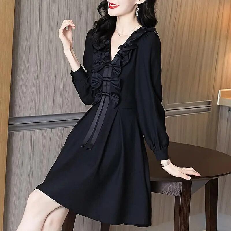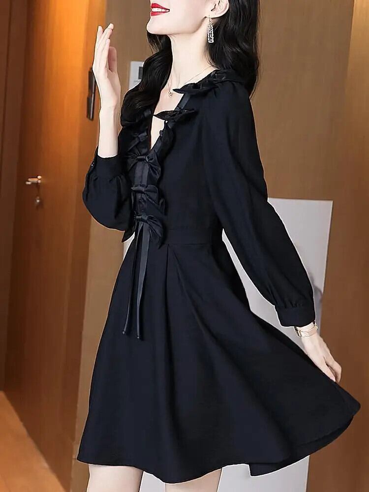 送料無料 V ネックスプライシングひだレースアップリボンミニドレスの女性 2024 春ルースソリッドカラーのオフィスレディドレス スプリング 春物 Vネック 会社 学校 通勤や通学にも AE1288776699633540820