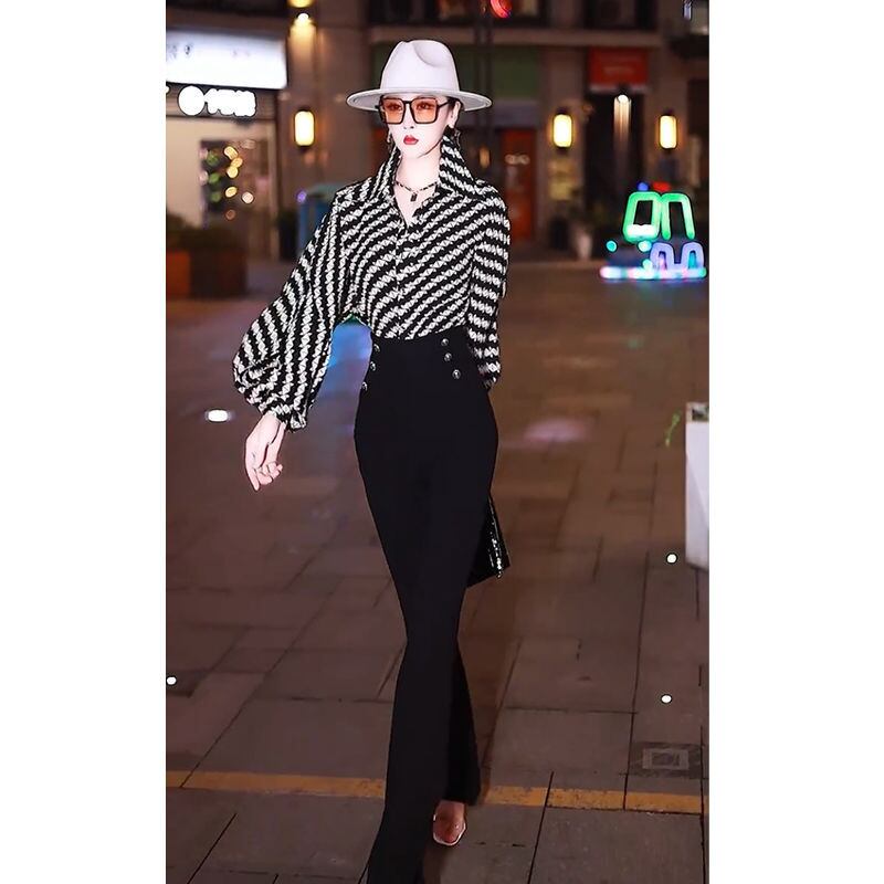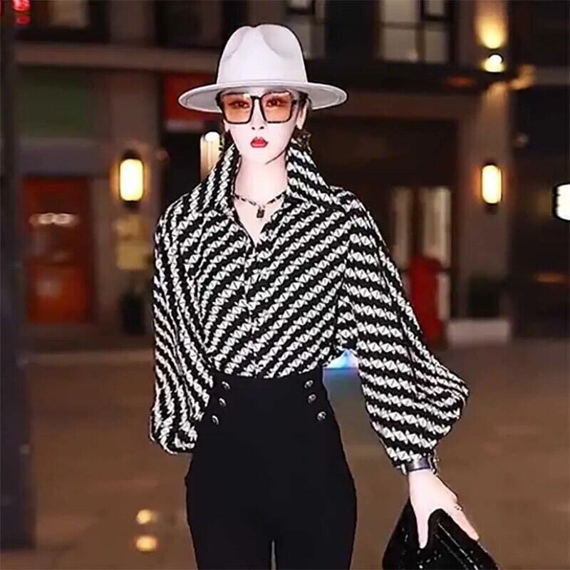 送料無料 ラペルプリントストライプランタンスリーブシャツ女性 2024 春ルーズオールマッチトップスオフィスレディブラウス スプリング 春物 会社 学校 通勤や通学にも AE1288776634267476612
