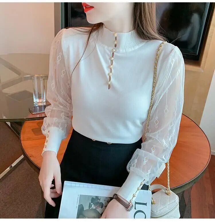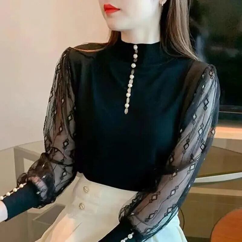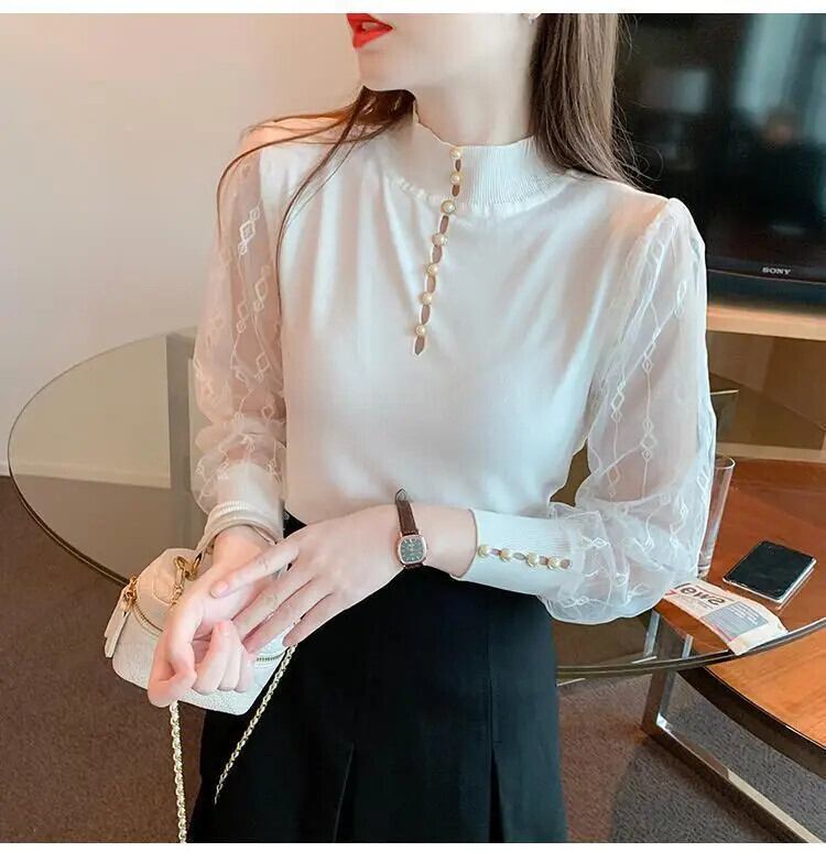 送料無料 スプライシング中空アウトガーゼビーズブラウス女性の 2023 秋冬プルオーバーオフィスレディシャツ オータム 秋物 ウィンター 冬物 会社 学校 通勤や通学にも AE1288776642184542675