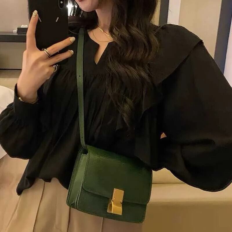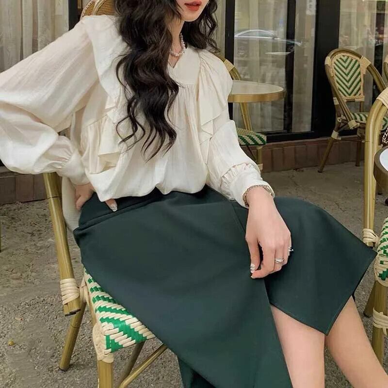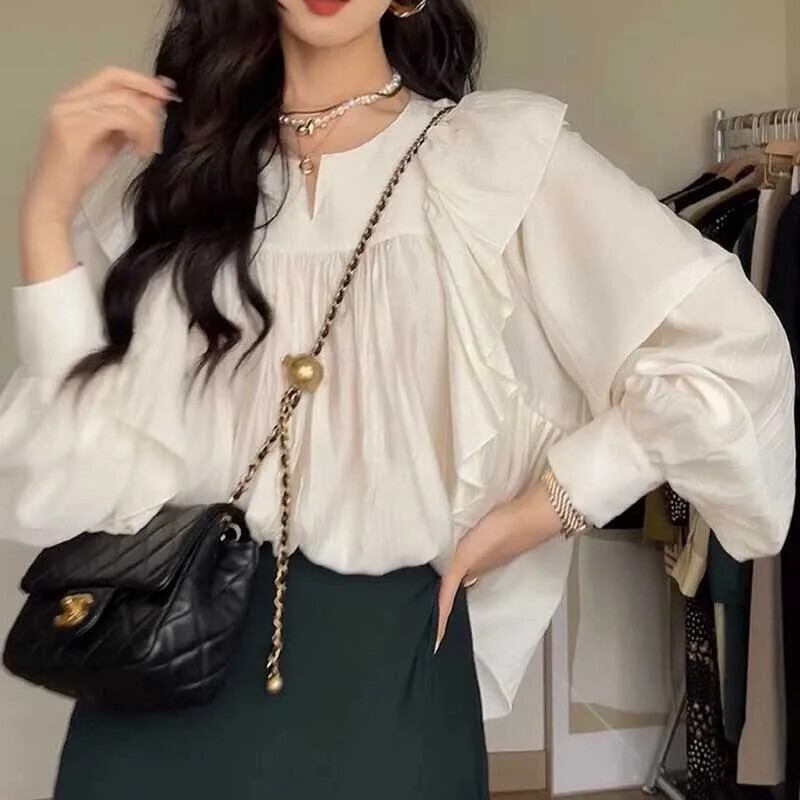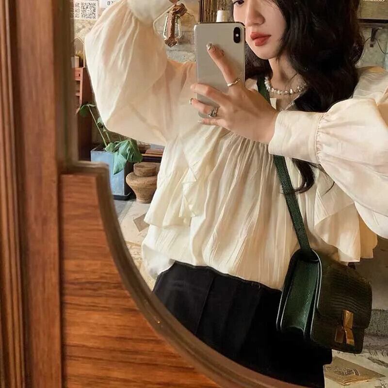 送料無料 ソリッドカラーひだランタンスリーブフリルブラウス女性 2024 春ルーズオールマッチトップスシャツ ラッフル スプリング 春物 AE1288776631118633251