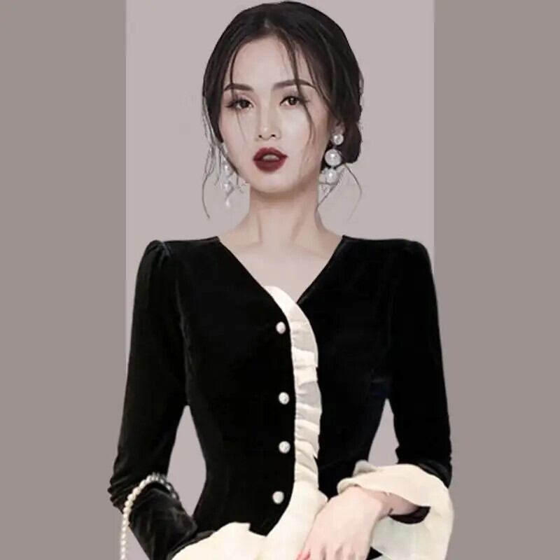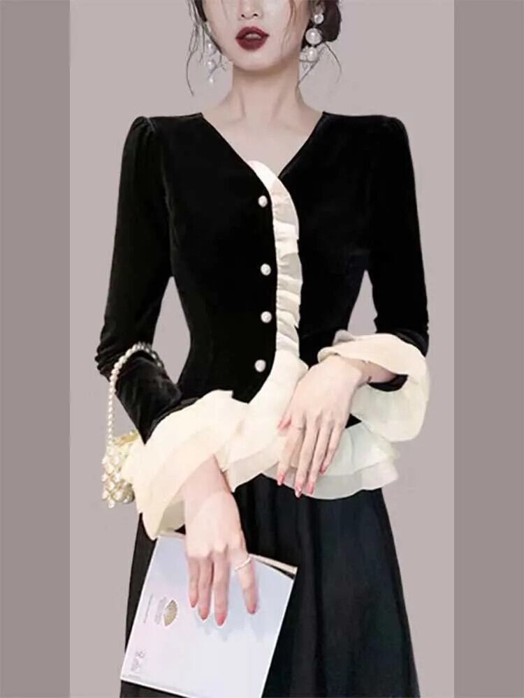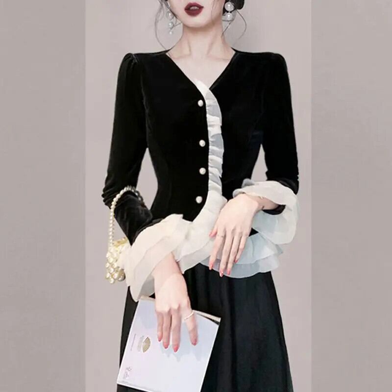 送料無料 フリルボタンスプライシングフレアスリーブシャツ女性の 2024 春ルーズトップスオフィスレディブラウス ラッフル スプリング 春物 会社 学校 通勤や通学にも AE1288776695743150103