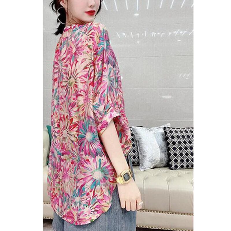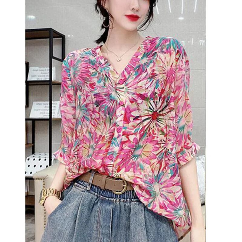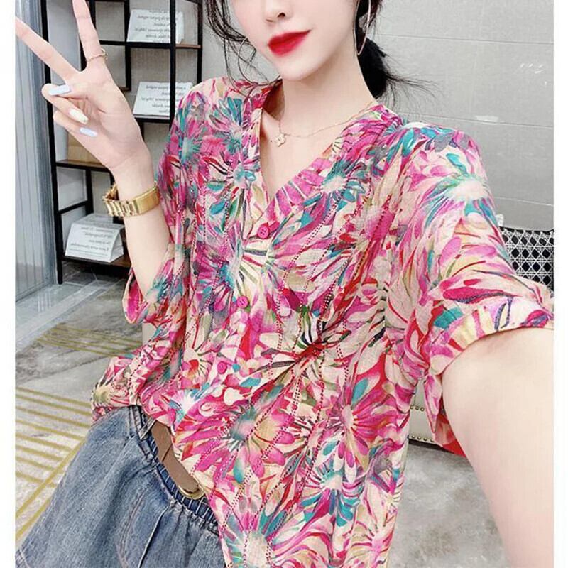 送料無料 ヴィンテージプリント V ネックオールマッチダイヤモンドシャツ女性の 2024 夏特大トップスルーズオフィスレディブラウス サマー 夏物 Vネック ビンテージ 会社 学校 通勤や通学にも AE128877665930531428