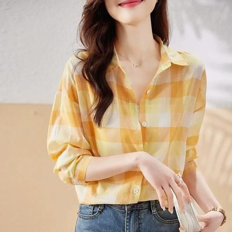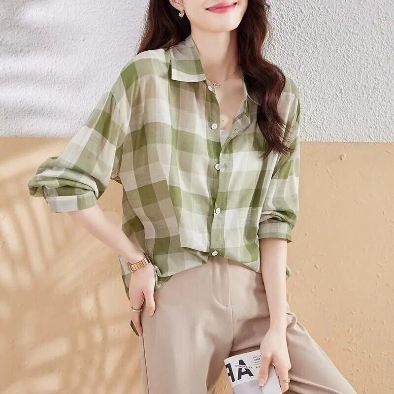 送料無料 プリントルーズオールマッチチェック柄シャツレディース 2023 春秋トップスオフィスレディブラウス スプリング 春物 オータム 秋物 会社 学校 通勤や通学にも AE1288776682971560847