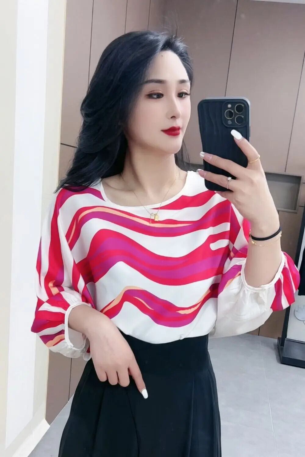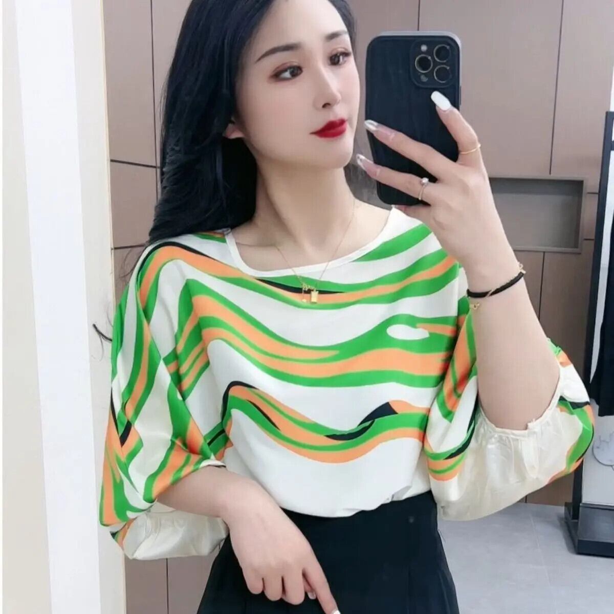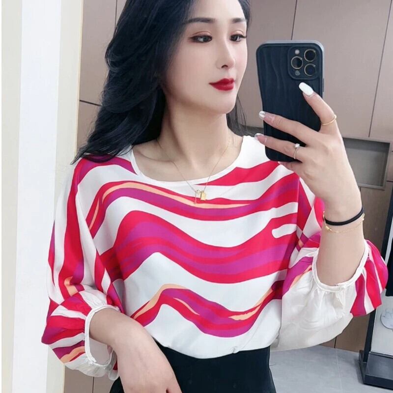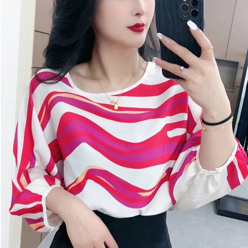 送料無料 O ネックプリントストライプバットウィングスリーブブラウス女性の 2024 夏ルーズオールマッチトップスオフィスレディシャツ サマー 夏物 Oネック 会社 学校 通勤や通学にも AE1288776692326568829