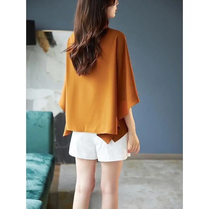 送料無料 ソリッドカラーのスプライシングシフォンバットウィングスリーブブラウス女性の 2024 夏ルーズトップスオフィスレディシャツ サマー 夏物 会社 学校 通勤や通学にも AE128877665212825806