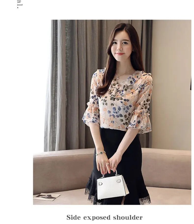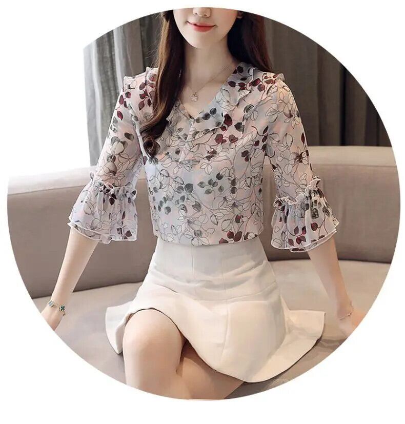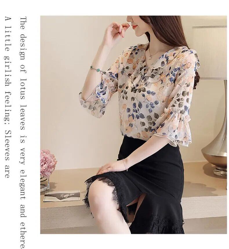 送料無料 Vネックフレアスリーブプリントフリル夏シフォンシャツオフィスレディプルオーバーオーバーサイズルーズレディースブラウス ラッフル サマー 夏物 会社 学校 通勤や通学にも AE1288776618595231046
