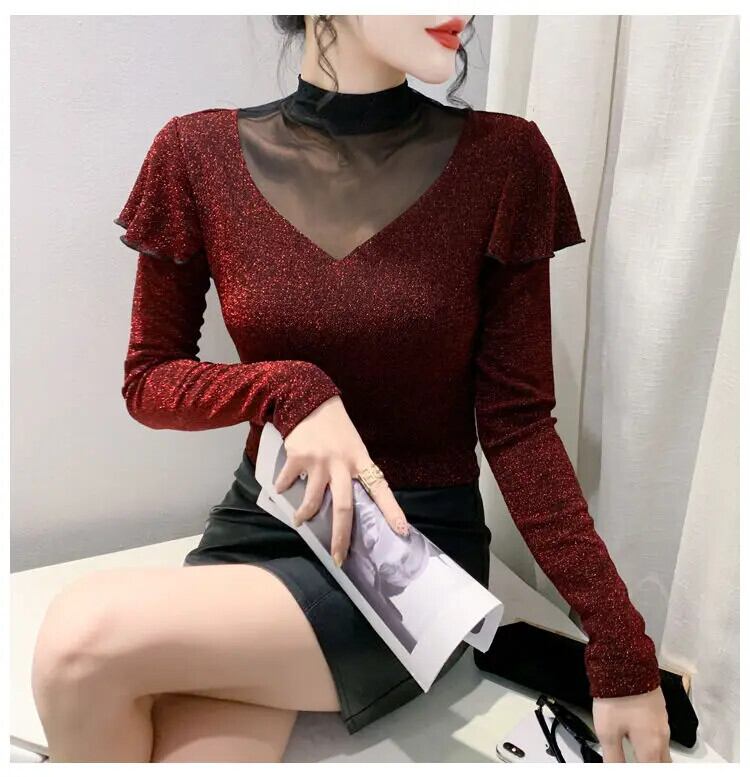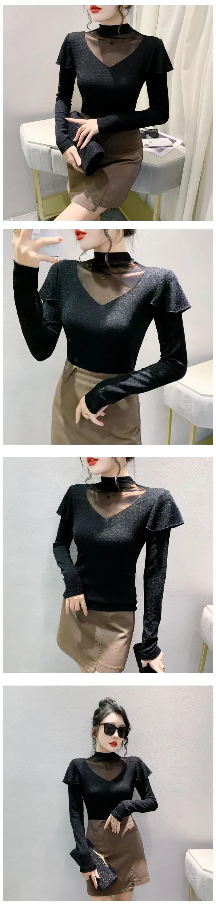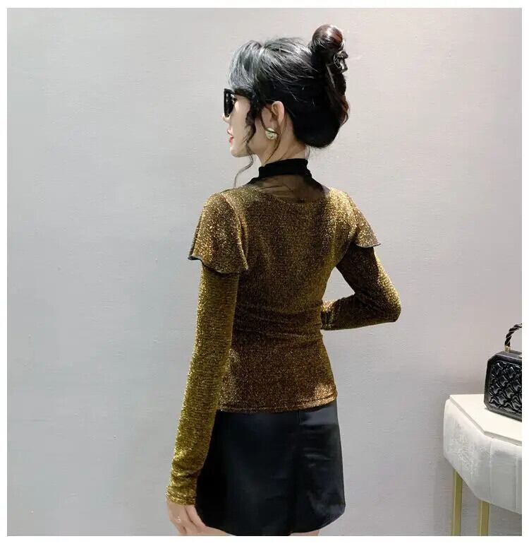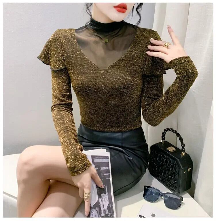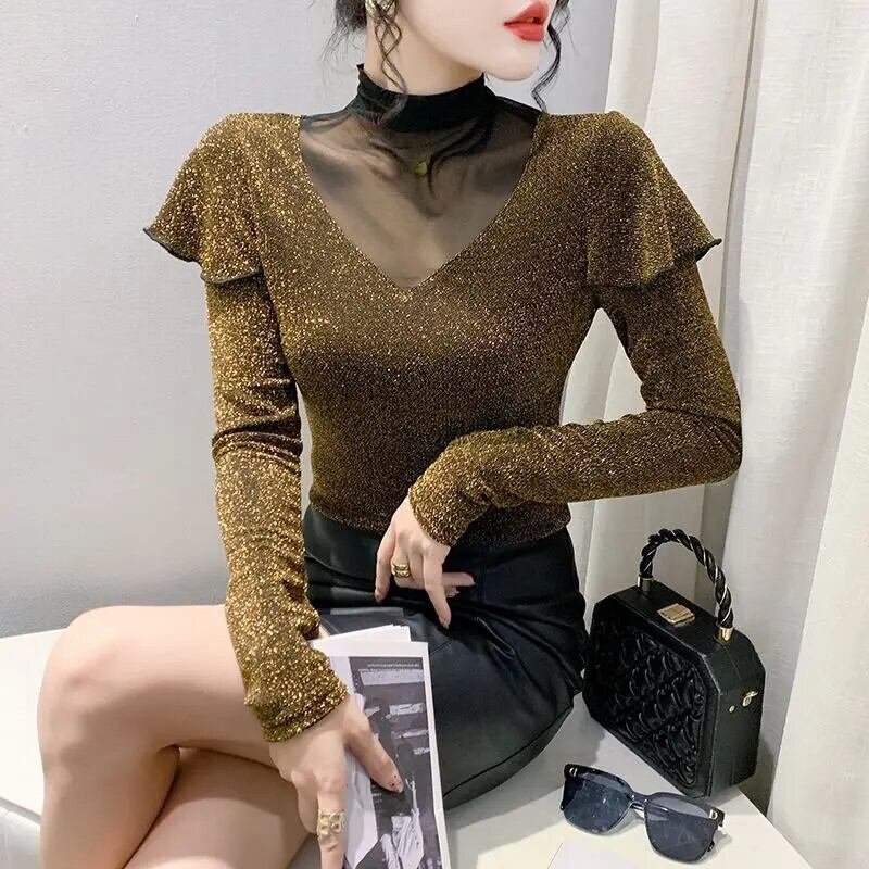 送料無料 スタンドカラーガーゼブライトシルクフリル Tシャツ女性の 2024 春スリムトップスオフィスレディ Tシャツ ラッフル スプリング 春物 会社 学校 通勤や通学にも AE1288776699155747157