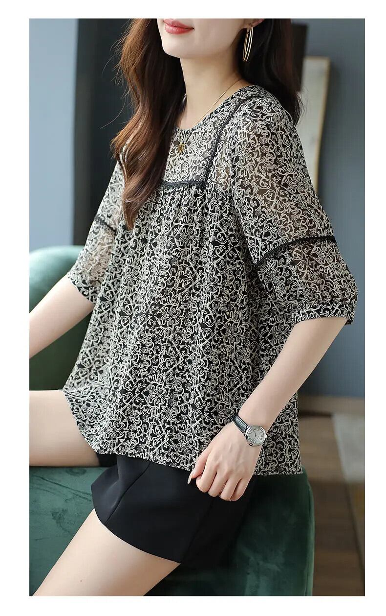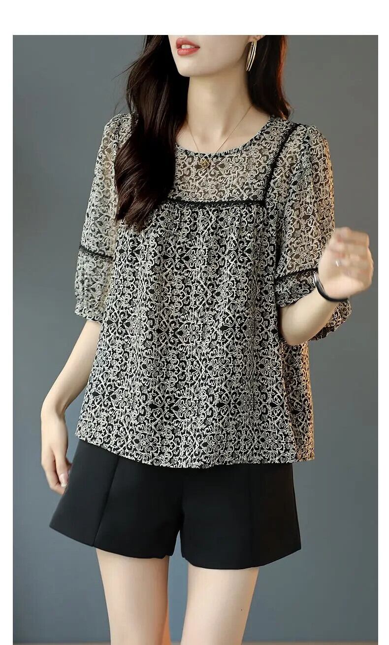 送料無料 ヴィンテージプリントスプライシングレースフリルブラウス女性の 2023 夏特大プルオーバーオフィスレディシャツ ラッフル サマー 夏物 ビンテージ 会社 学校 通勤や通学にも AE1288776668016155847