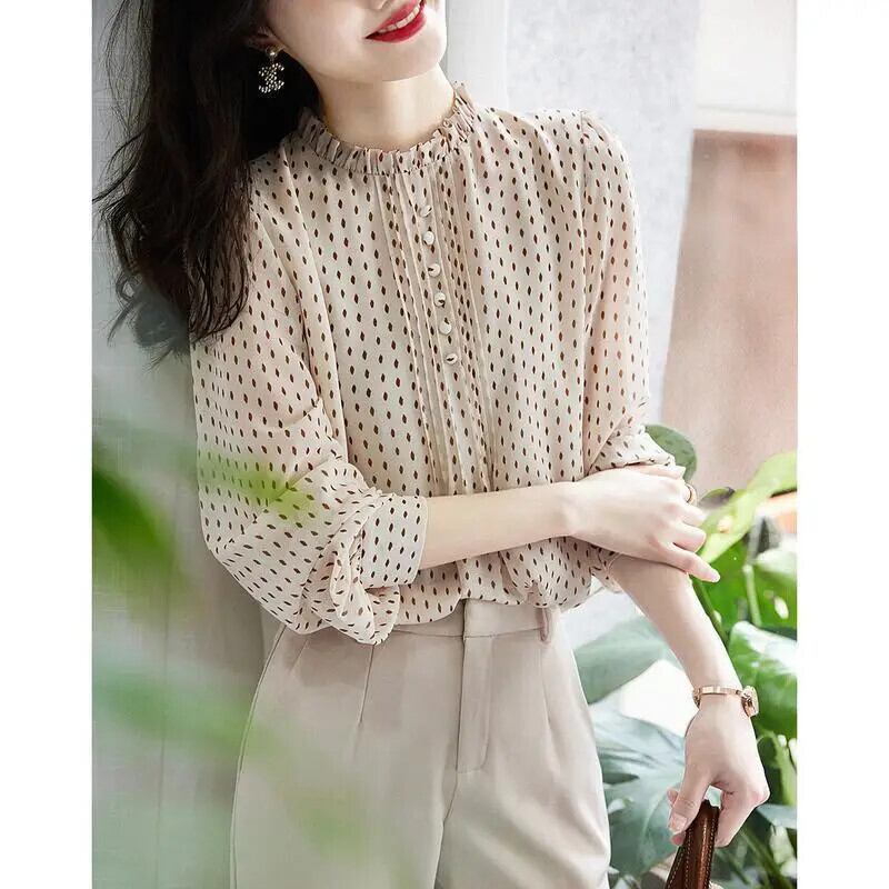 送料無料 ルーズスタンドカラープリントひだシフォンブラウス女性の 2023 秋特大トップスパフスリーブシャツ オータム 秋物 AE1288776661191342302