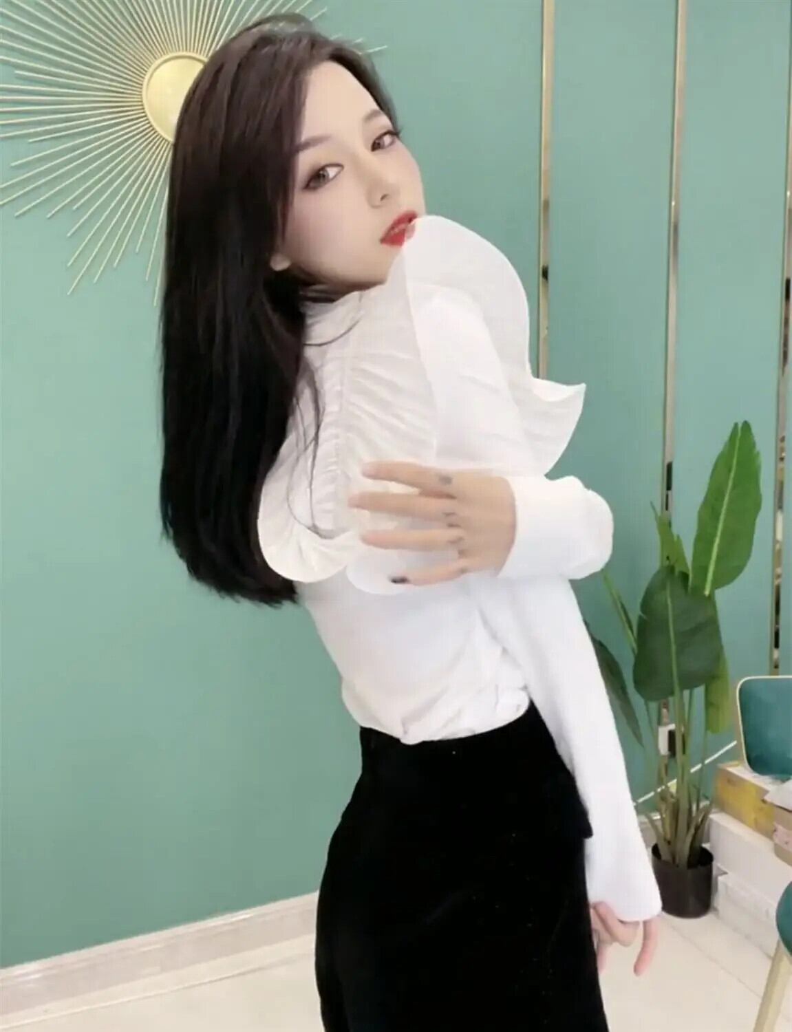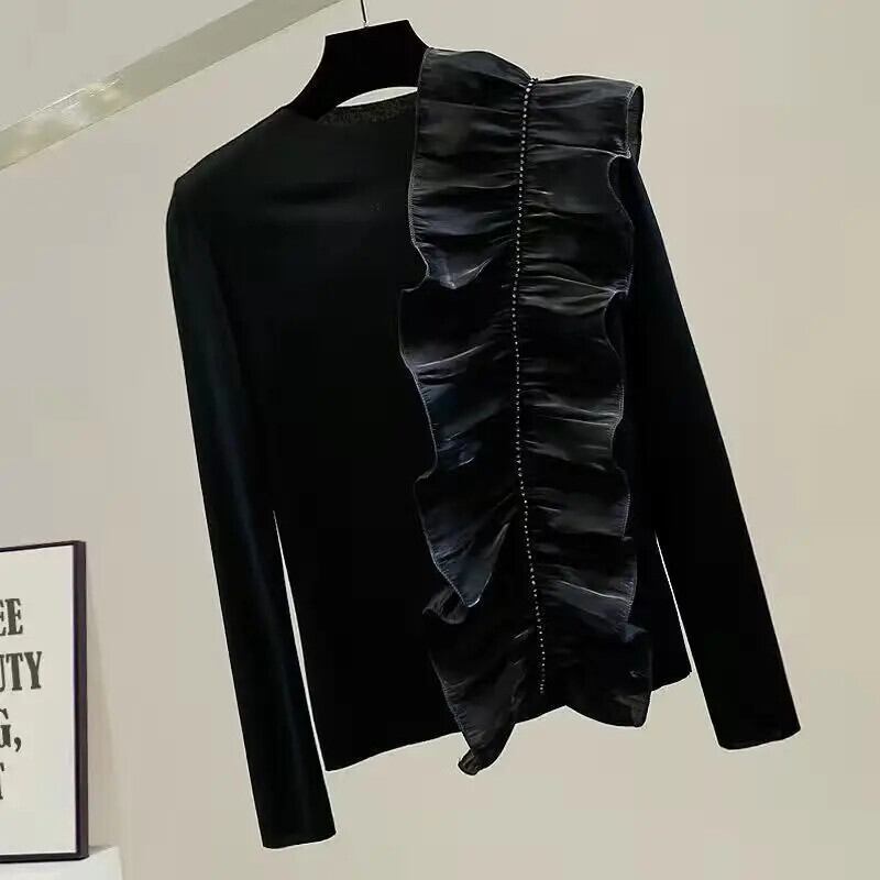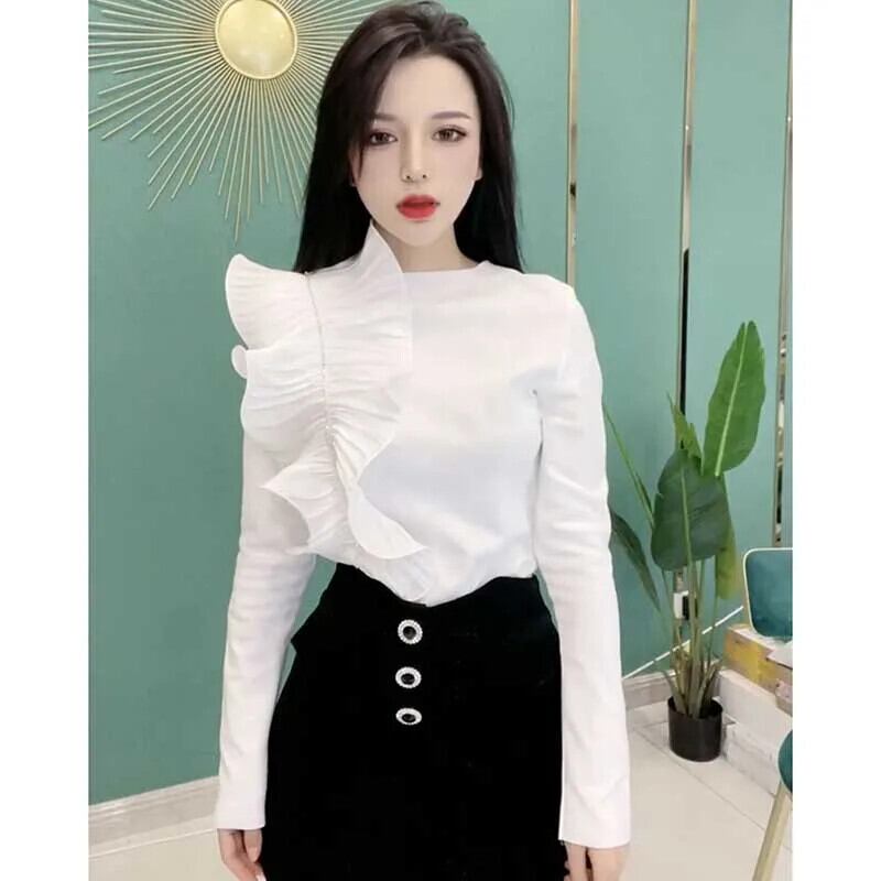 送料無料 O ネック非対称ダイヤモンドフリルブラウス女性の 2024 春ルーズトップスオフィスレディシャツ スプリング 春物 Oネック 会社 学校 通勤や通学にも AE1288776681601375454