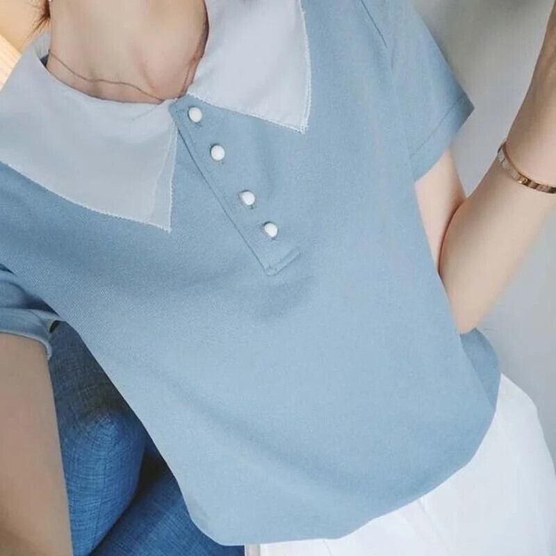 送料無料 ピーターパンカラースプライシングルーズブラウス女性の2023夏プルオーバーオールマッチ通勤シャツ サマー 夏物 AE1288776681939418649