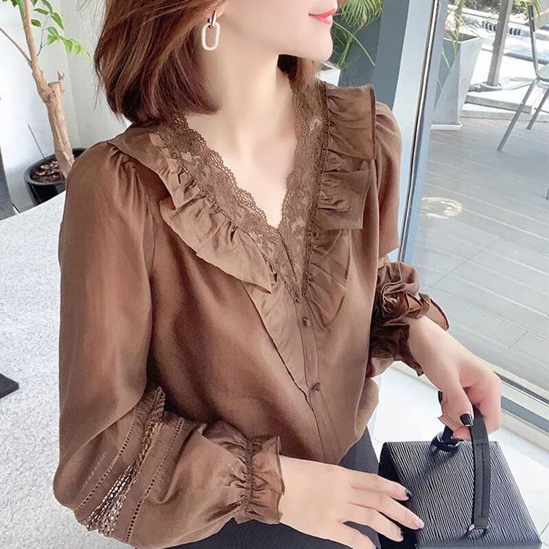 送料無料 レーススプライシング中空ひだフリルブラウス女性の 2023 秋プルオーバールーズランタンスリーブシャツ ラッフル オータム 秋物 AE1288776614630394203