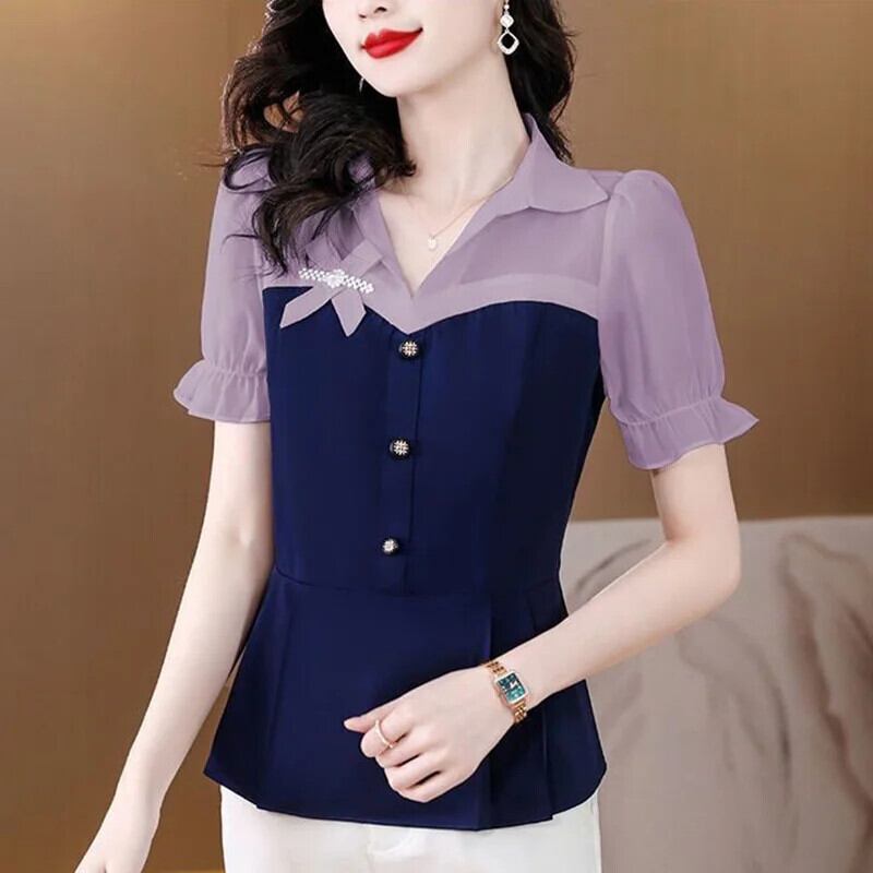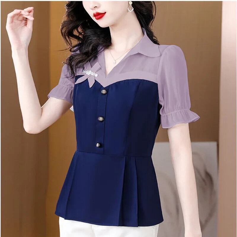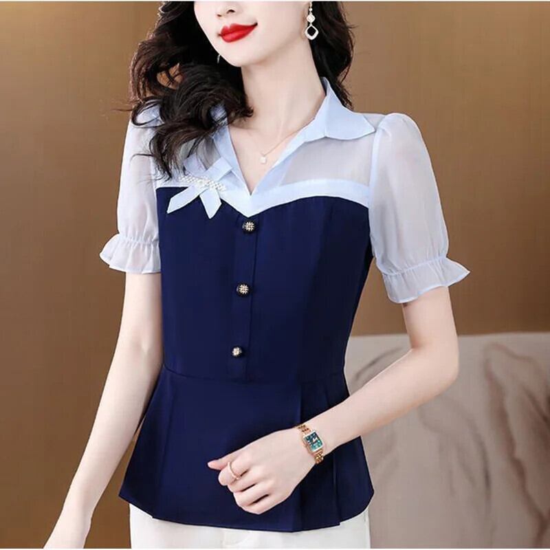 送料無料 ラペルスプライシングルーズひだボウブラウス女性の 2023 夏プルオーバーオフィスレディ偽 2 枚シャツ リボン サマー 夏物 会社 学校 通勤や通学にも AE128877668352751375