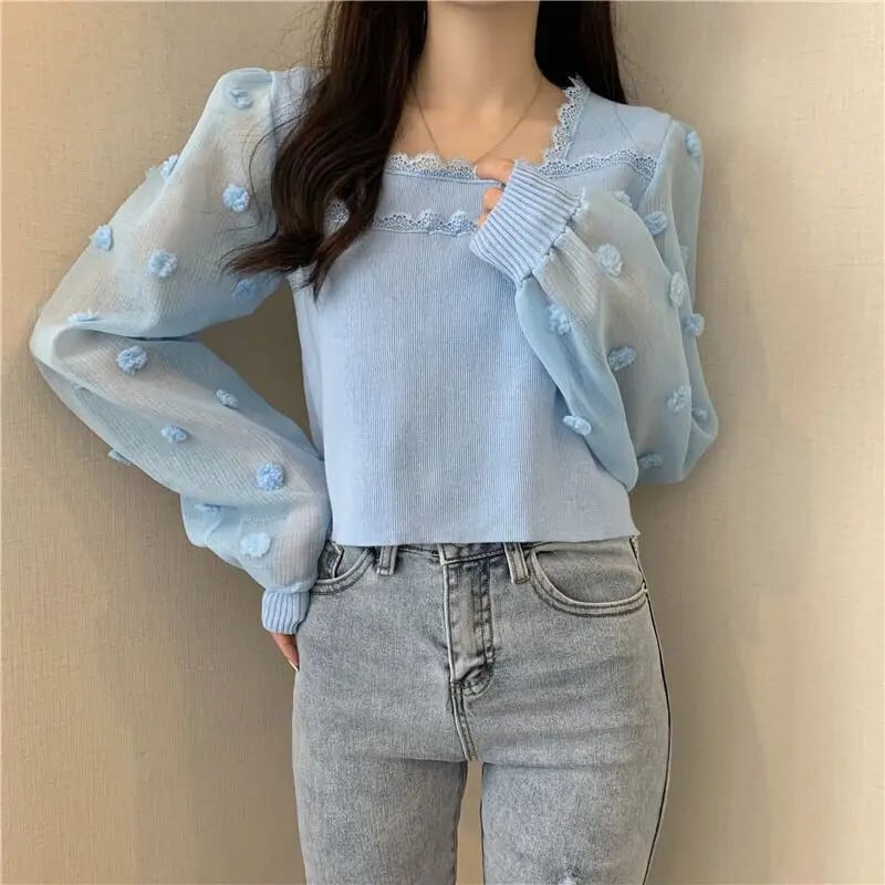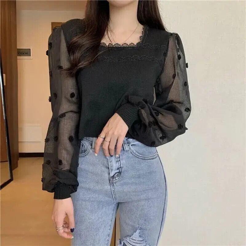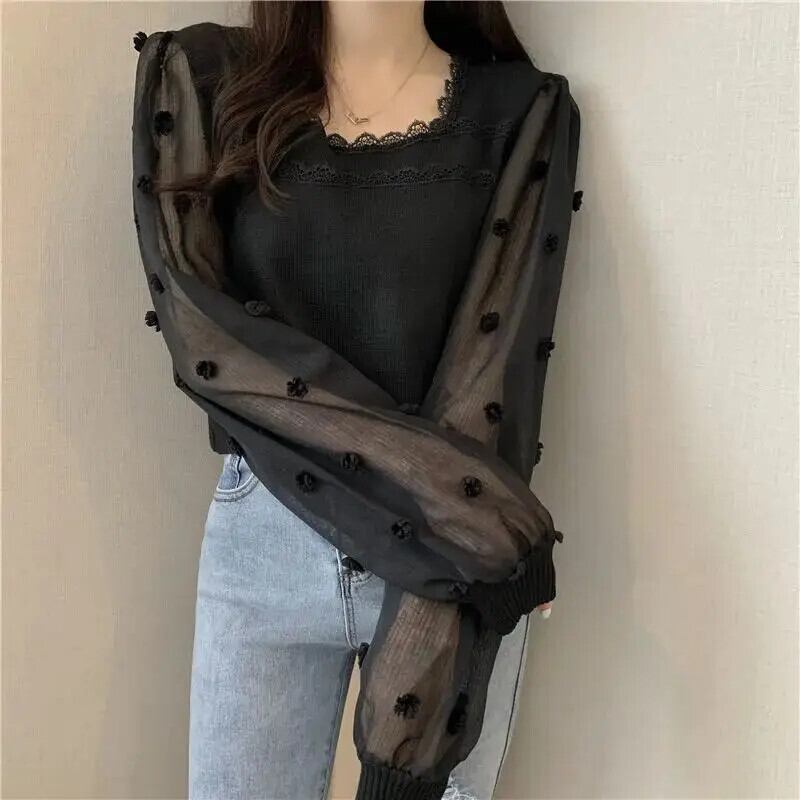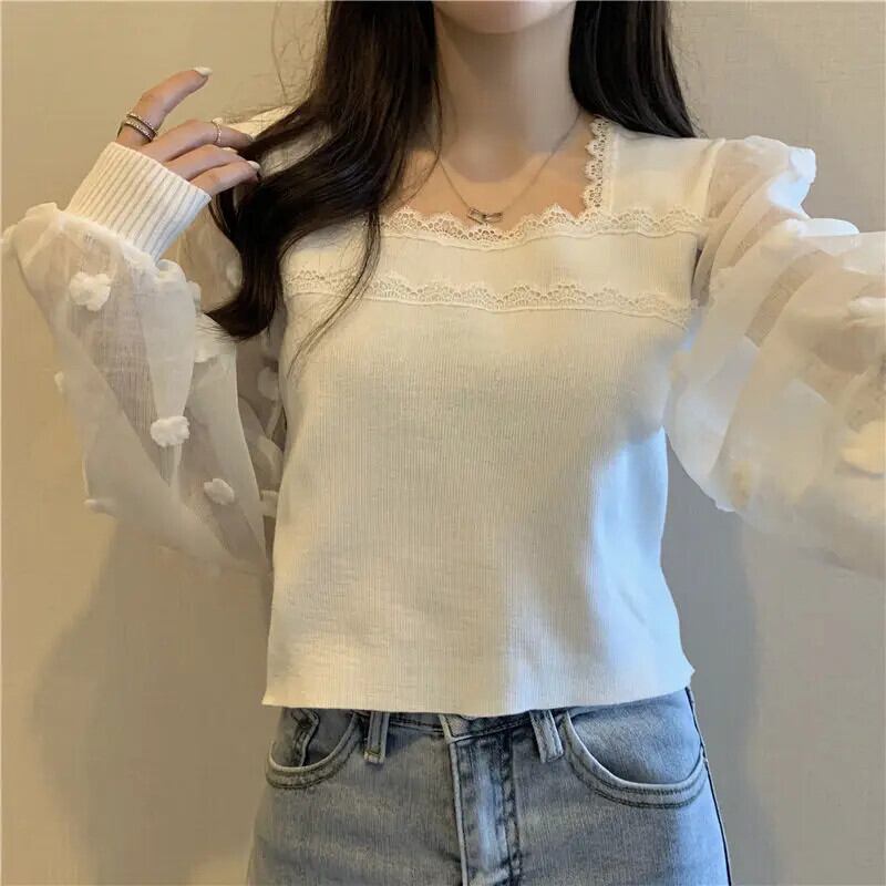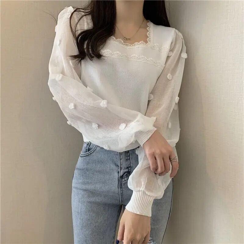 送料無料 ガーゼ装飾スプライシングレースブラウス服 2023 秋冬ルーズトップス無地甘いシャツ 大人ガーリー スウィート キュート カジュアル オータム 秋物 ウィンター 冬物 ソリッドカラー AE1288776642912767343