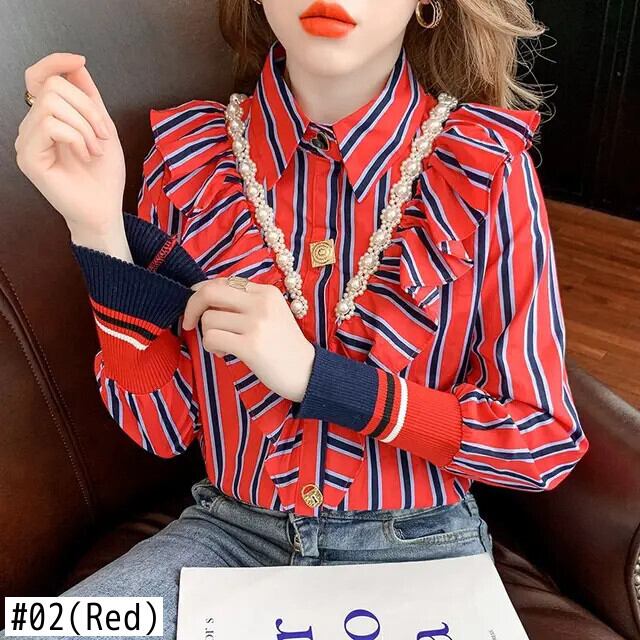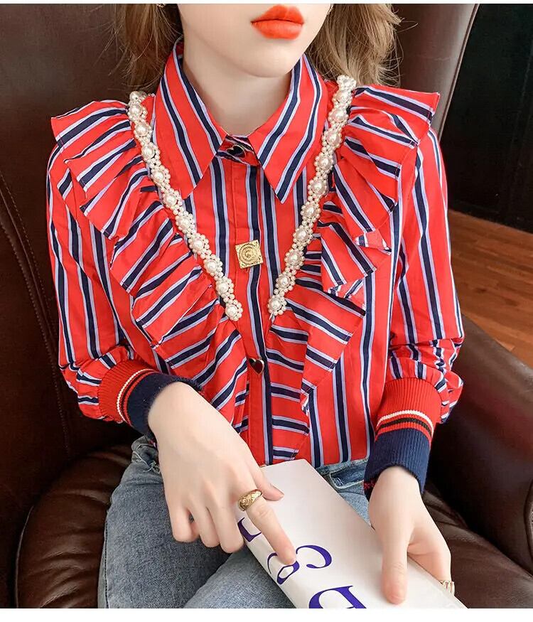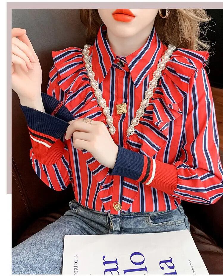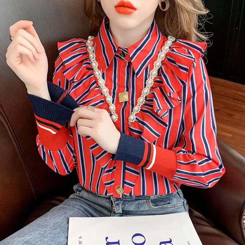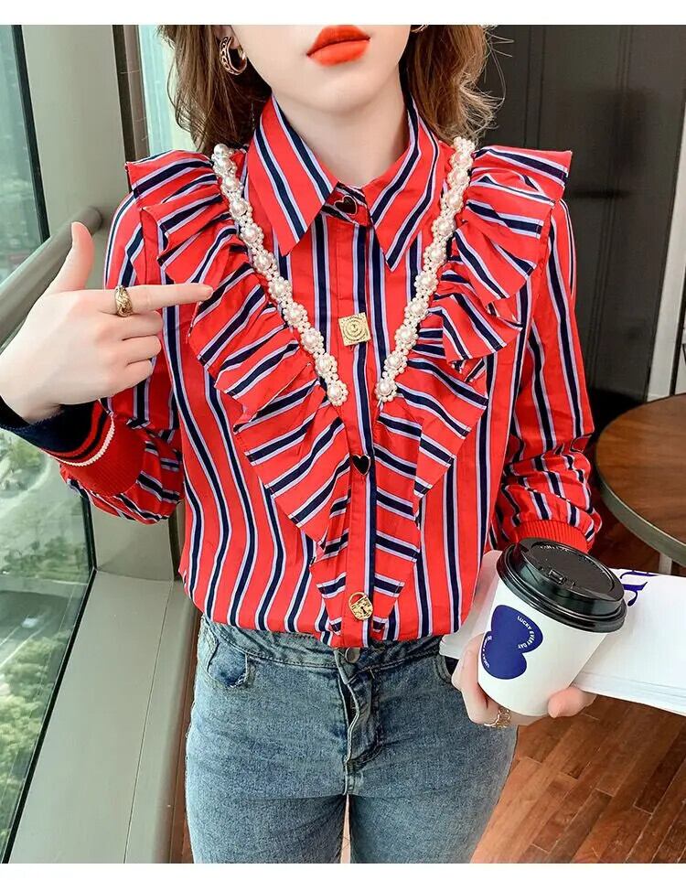 送料無料 プリントスプライシングビーズフリルストライプシャツ女性の 2023 秋冬トップスオフィスレディブラウス ラッフル オータム 秋物 ウィンター 冬物 会社 学校 通勤や通学にも AE1288776649204349674