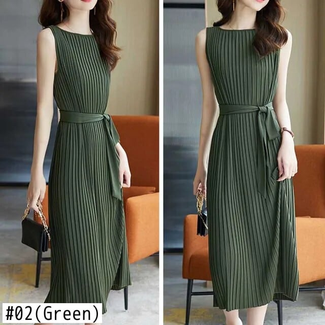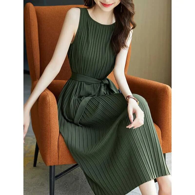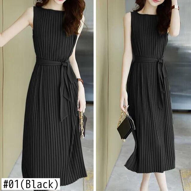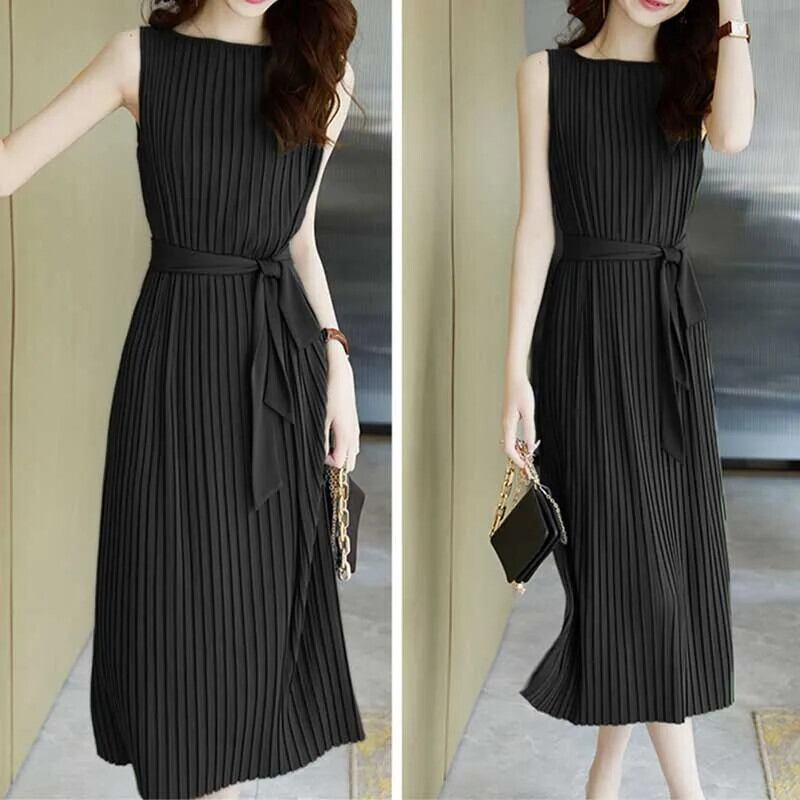 送料無料 O ネックソリッドカラー包帯ノースリーブプリーツミディドレス女性 2024 夏ルーズオフィスレディドレス サマー 夏物 Oネック 会社 学校 通勤や通学にも AE1288776690337233991