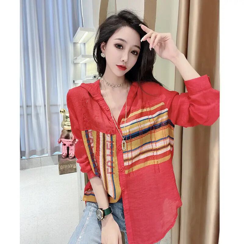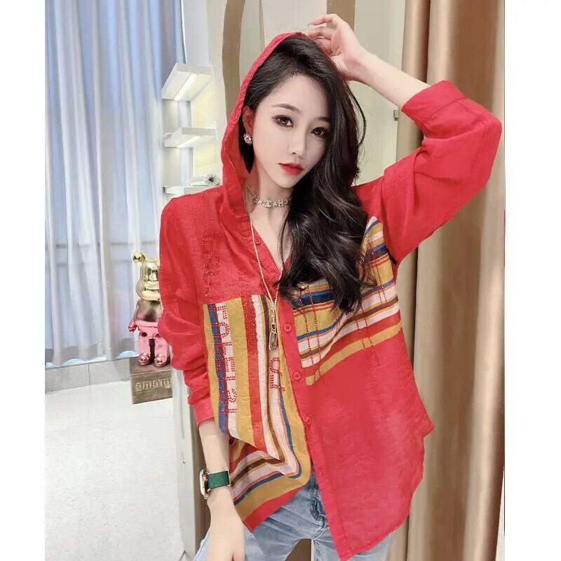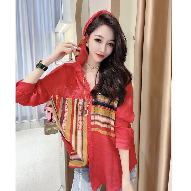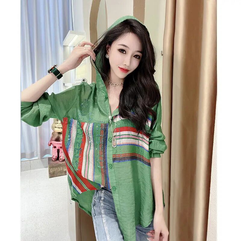 送料無料 プリント非対称ダイヤモンドフード付きストライプシャツ女性の 2023 夏オーバーサイズトップスブラウス サマー 夏物 AE1288776611252404354