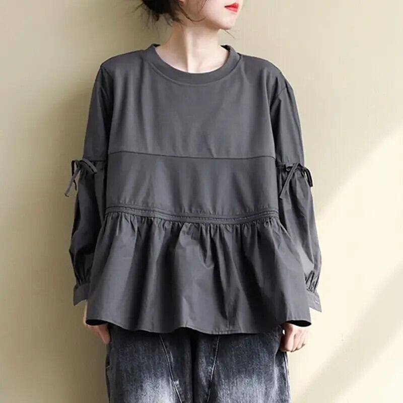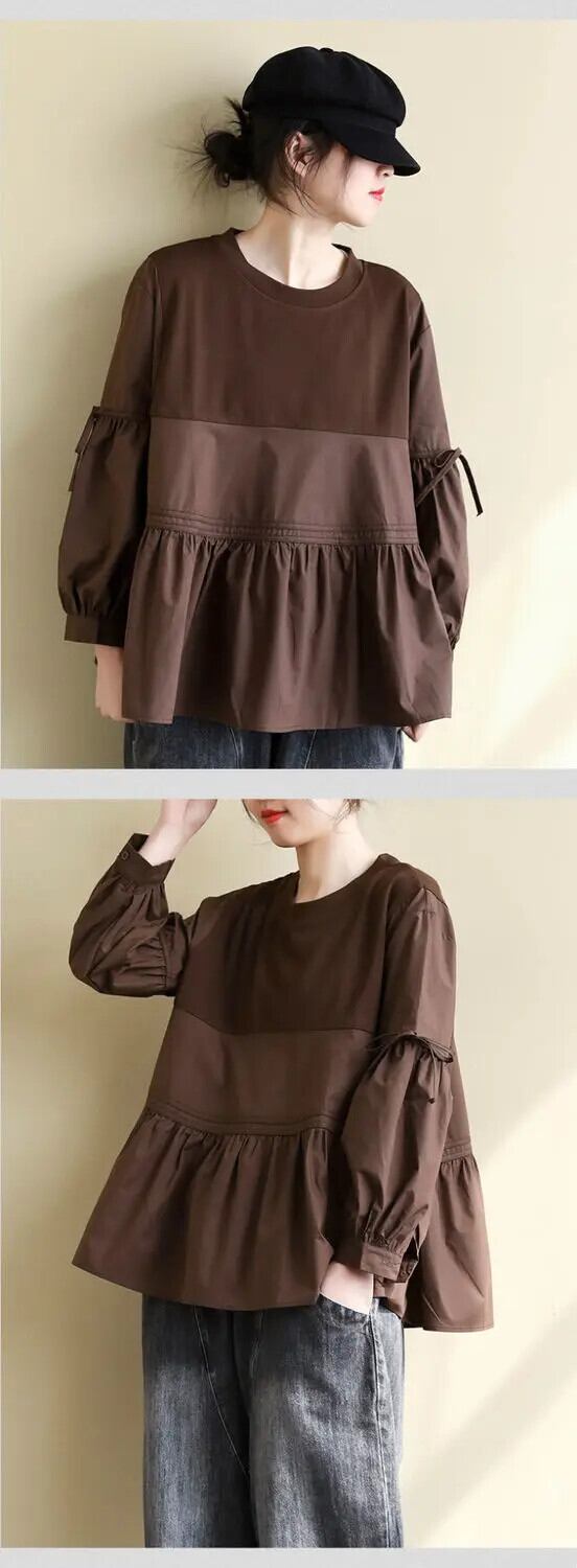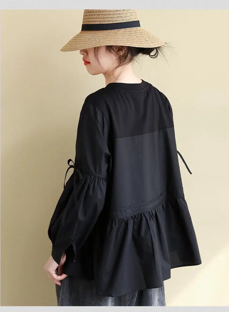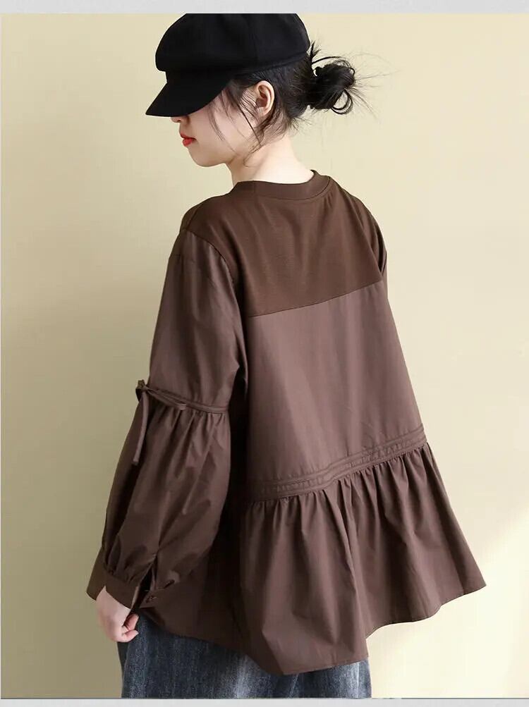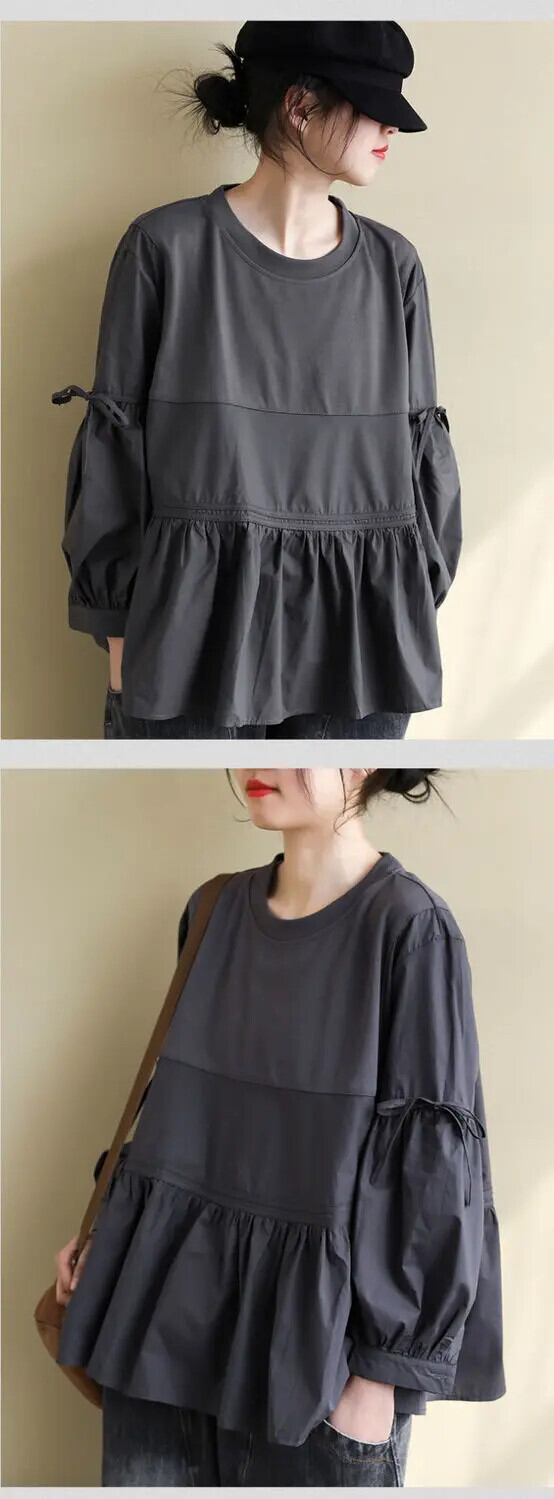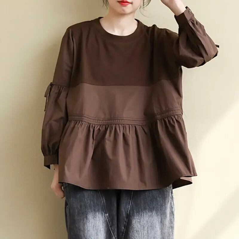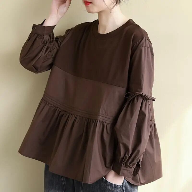 送料無料 ひだレースアップスプライシングランタンスリーブブラウス秋ルーズプルオーバー無地女性通勤シャツ オータム 秋物 ソリッドカラー AE1288776680727485674