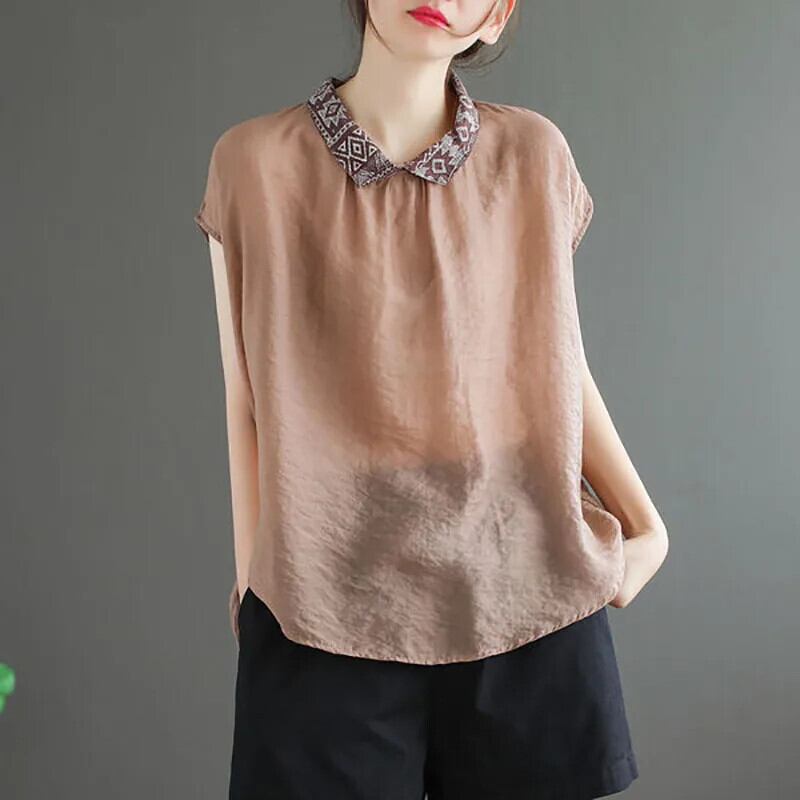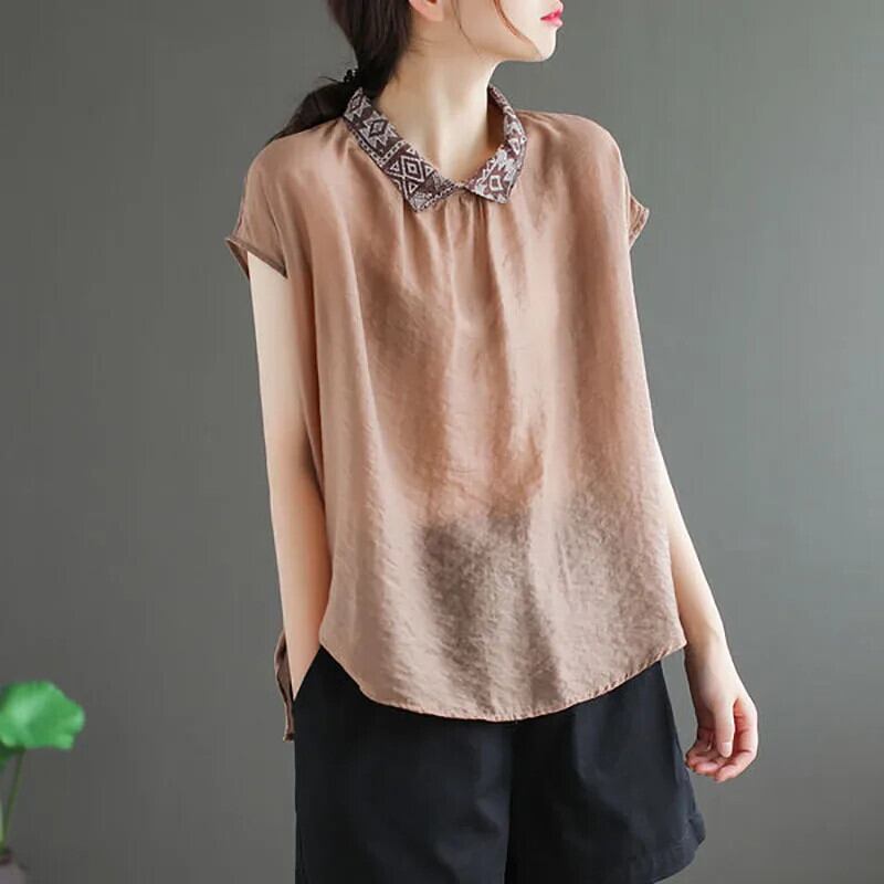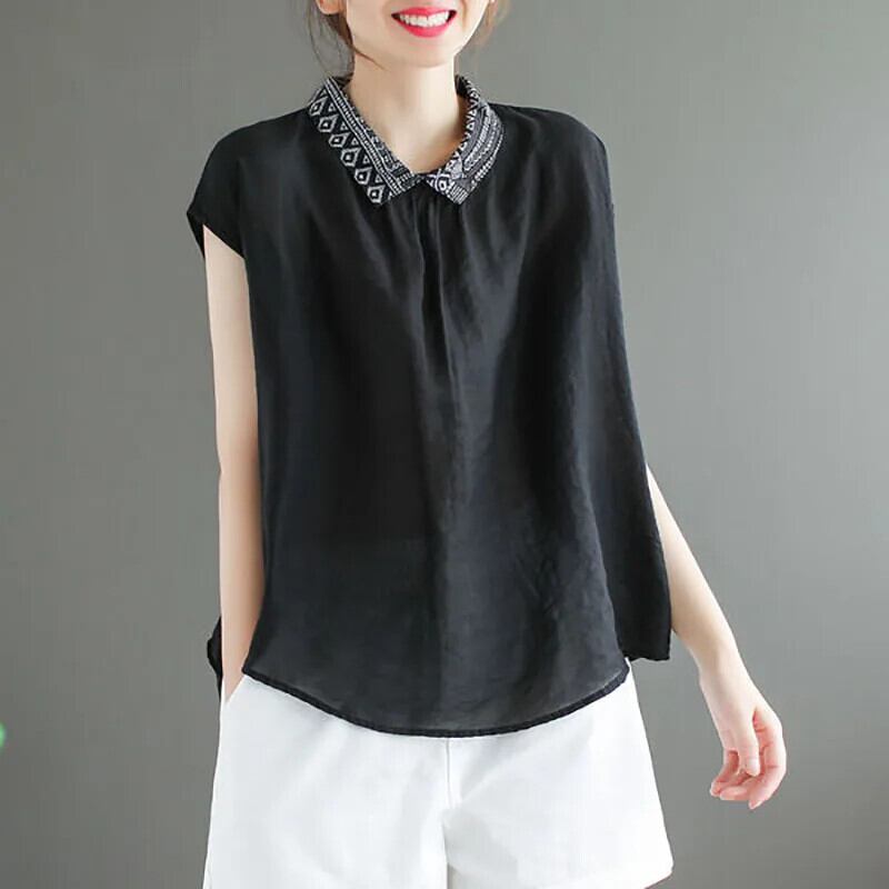 送料無料 ラペルスプライスボタンプリント不規則なブラウス女性の 2024 夏プルオーバールーズ非対称シャツ サマー 夏物 AE1288776636321237897