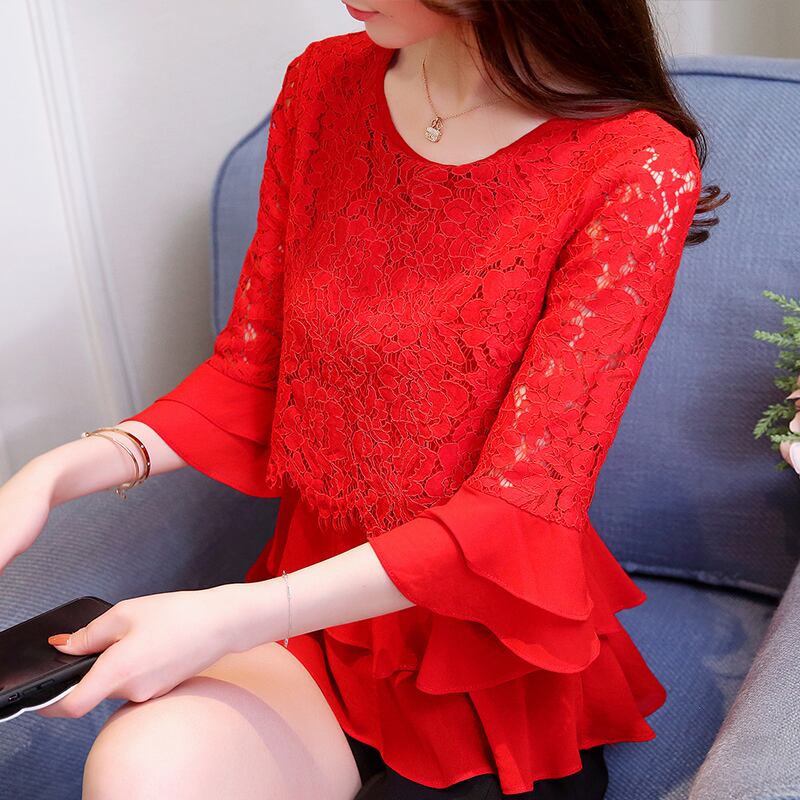 送料無料 スプライスレースフリルフレアスリーブ中空アウトブラウス2023夏特大トップス甘いシャツ ラッフル 大人ガーリー スウィート キュート カジュアル サマー 夏物 AE1288776621533383958