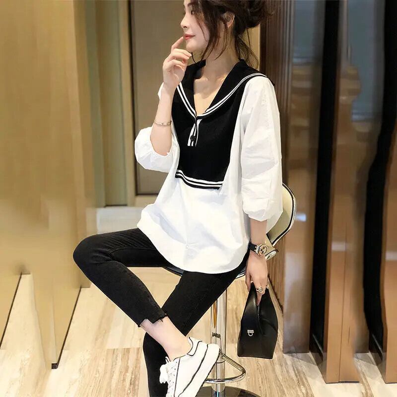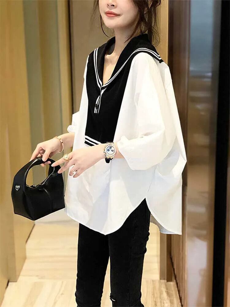 送料無料 セーラー襟スプライシング偽ツーピースブラウス 2024 春夏ルーズトップスシャツ スプリング 春物 サマー 夏物 AE1288776674596606361