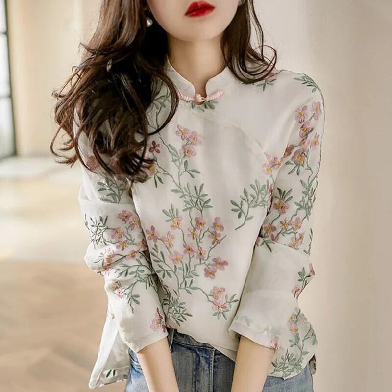 送料無料 ヴィンテージプリントスタンドカラー花柄ブラウス女性の 2024 春夏ルーズオールマッチトップスオフィスレディシャツ スプリング 春物 サマー 夏物 ビンテージ 会社 学校 通勤や通学にも AE1288776691092787610