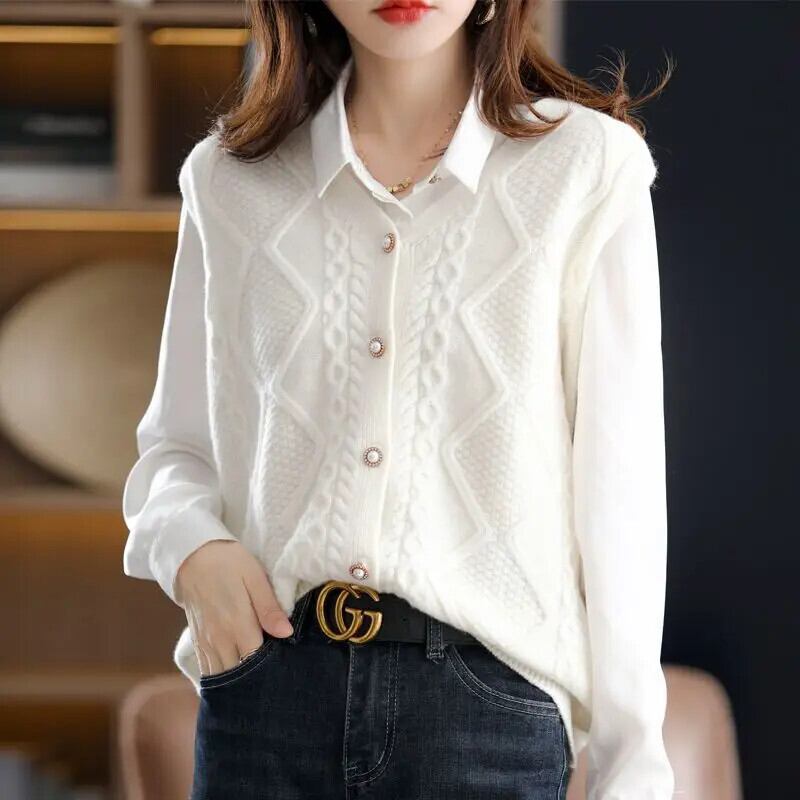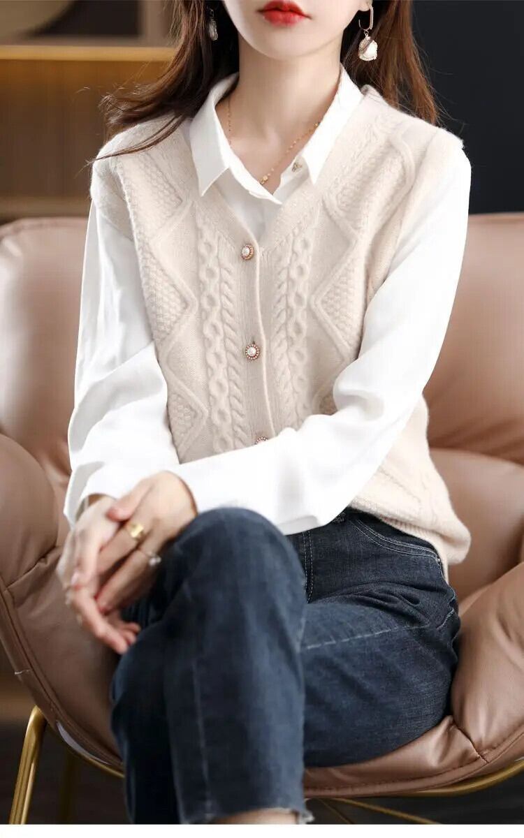 送料無料 V ネックソリッドカラーボタンルーズノースリーブベストセーター女性の 2022 秋プルオーバートップス オータム 秋物 Vネック AE1288776648076938402