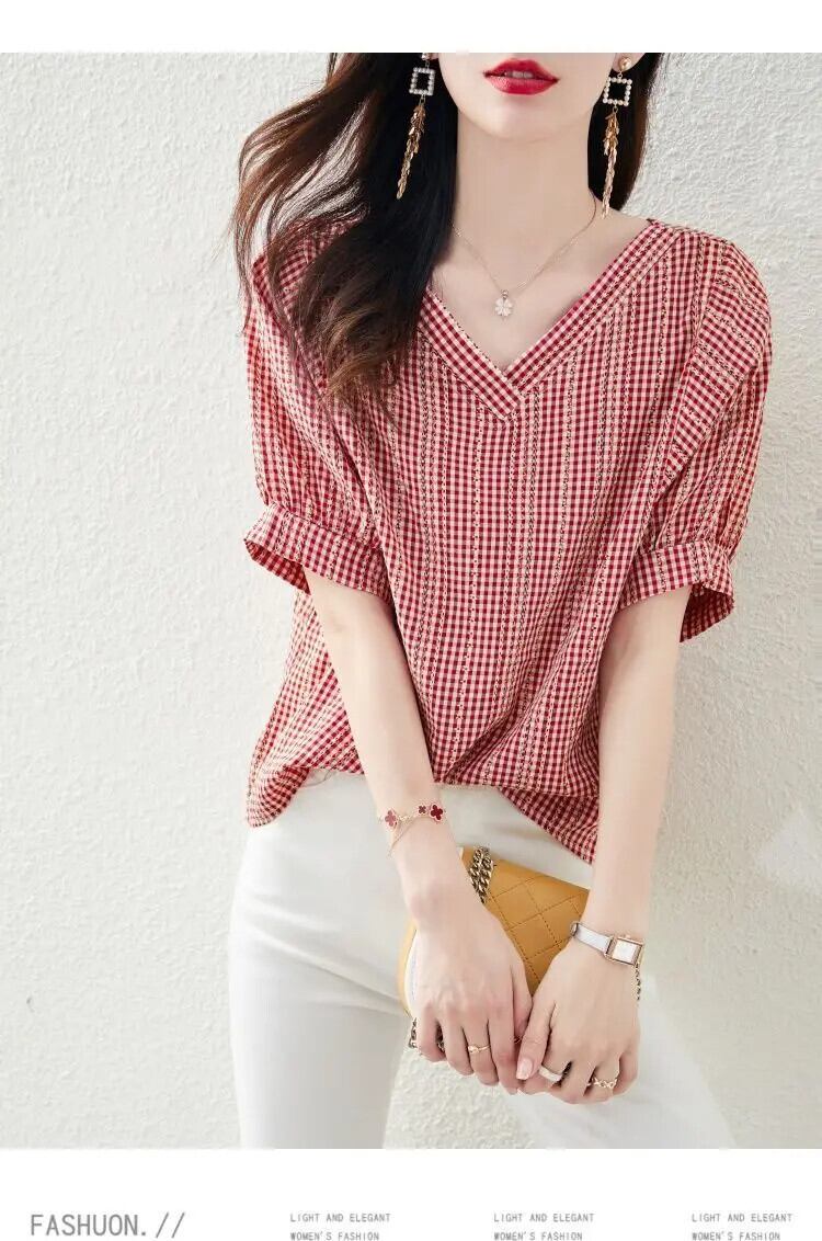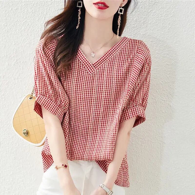 送料無料 ヴィンテージプリントチェック柄 V ネック特大パフスリーブシャツ 2022 夏プルオーバー通勤女性のルーズブラウス サマー 夏物 Vネック ビンテージ AE1288776659028021412