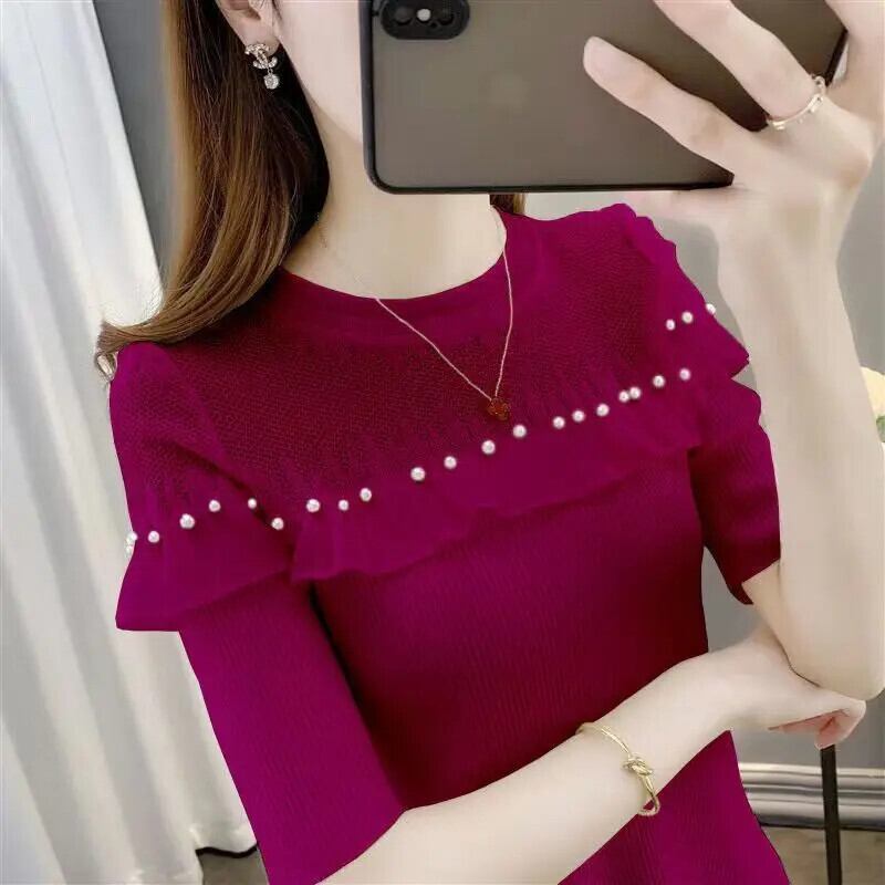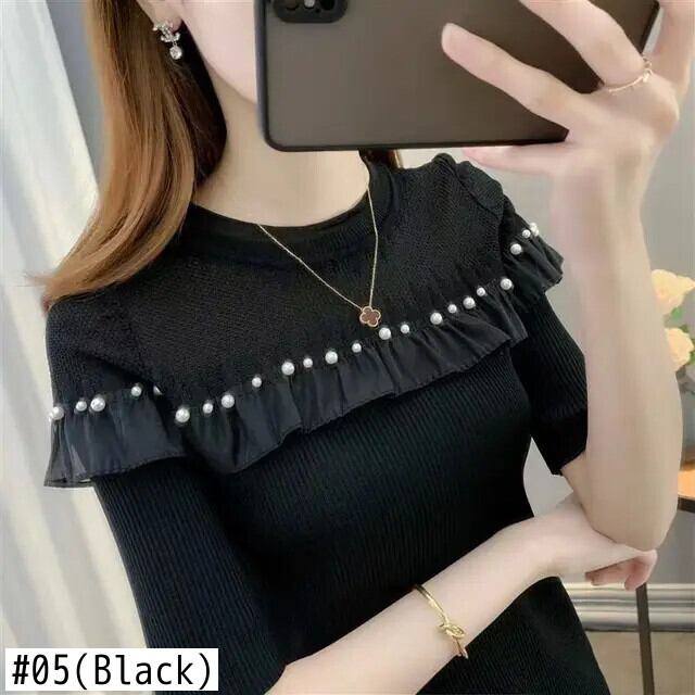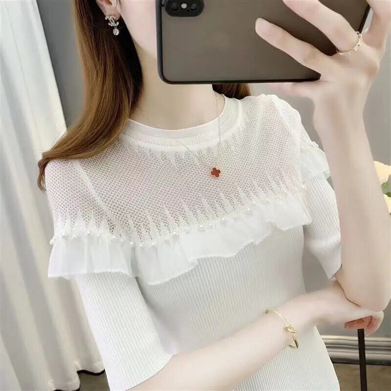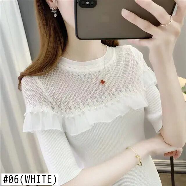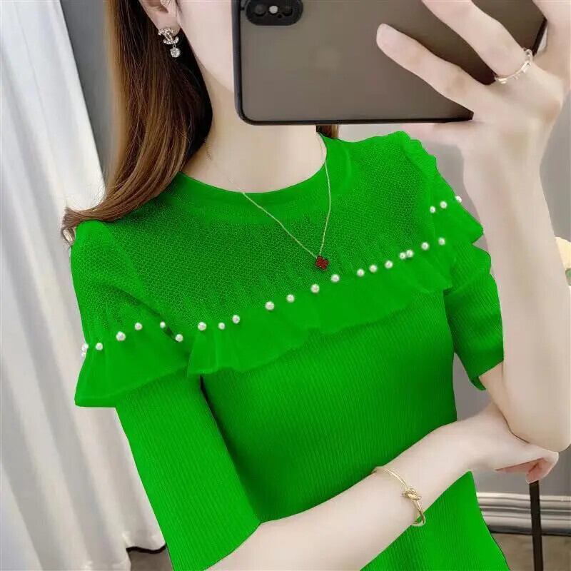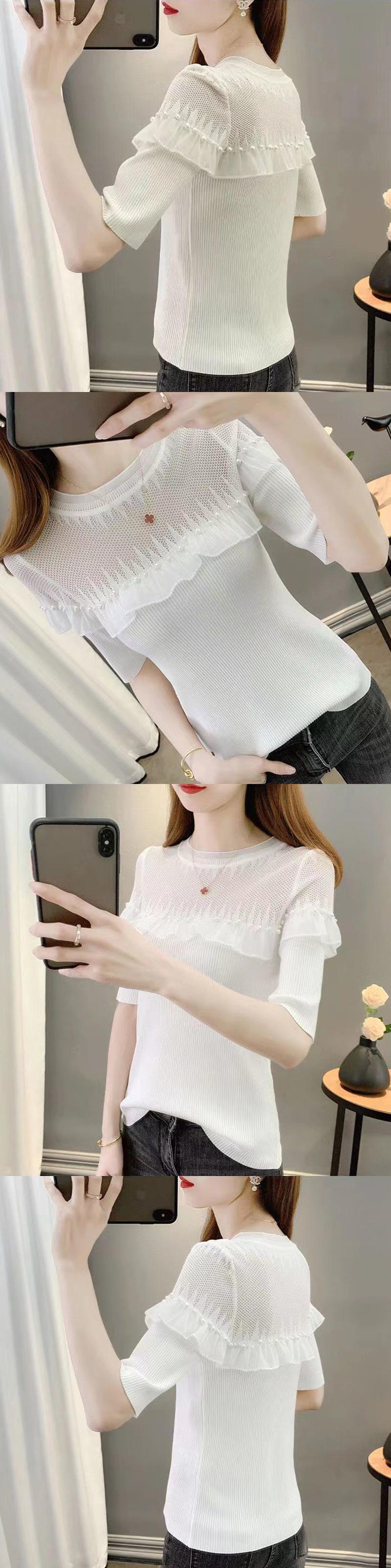 送料無料 ソリッドカラースプライシングフリルビーズブラウス 2023 夏プルオーバートップスルーズオフィスレディシャツ ラッフル サマー 夏物 会社 学校 通勤や通学にも AE1288776681985517066