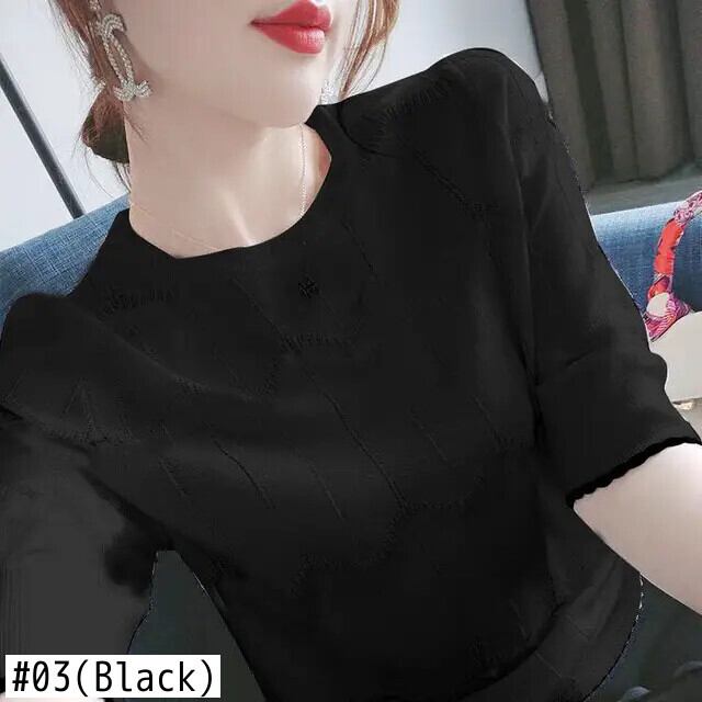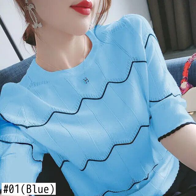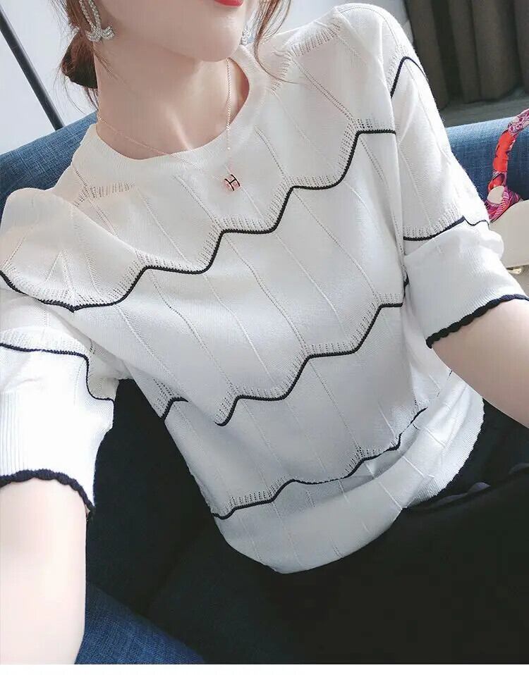送料無料 O ネック ニット スプライス ルーズ ストライプ ブラウス レディース 2023 春プルオーバー半袖シャツ ショート ハーフスリーブ スプリング 春物 Oネック AE128877663002753317