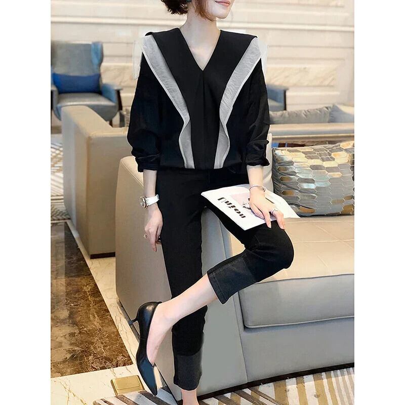送料無料 V ネックスプライシングひだフリルブラウス女性の 2023 秋冬ルーズオフィスレディプルオーバーシャツ ラッフル シャツ オータム 秋物 ウィンター 冬物 Vネック 会社 学校 通勤や通学にも AE1288776684053552122