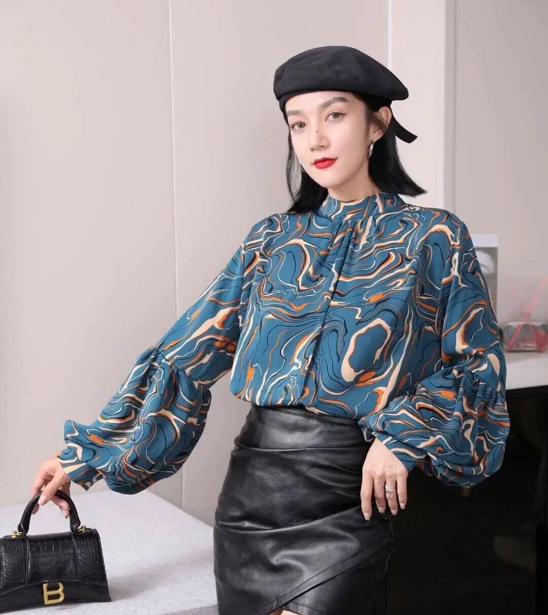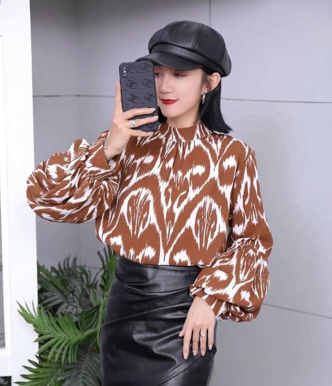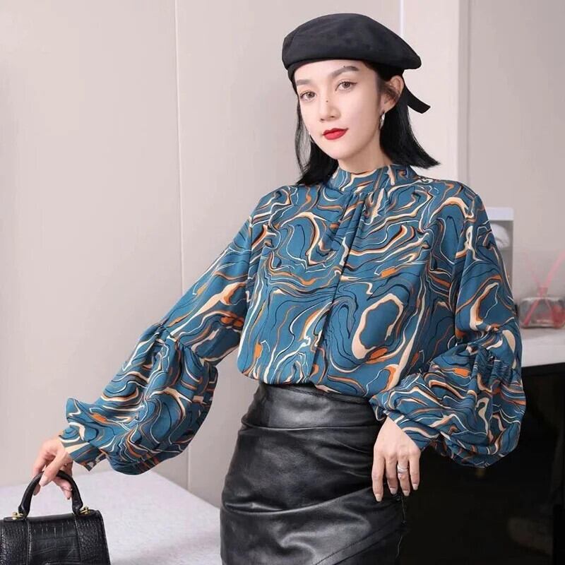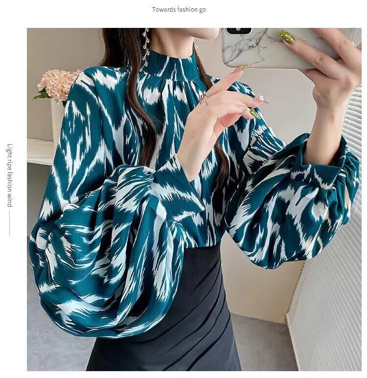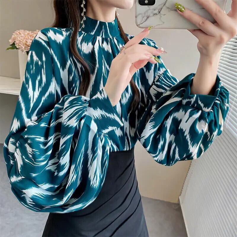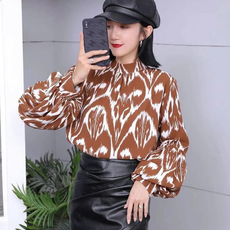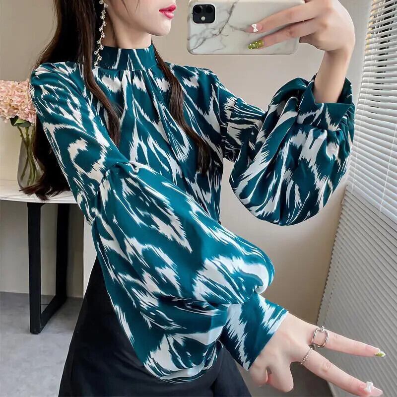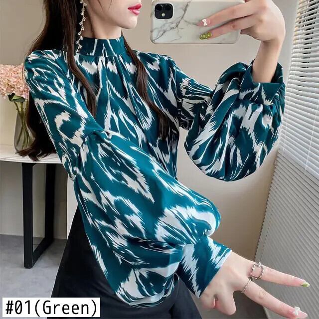 送料無料 スタンドカラーランタンスリーブプリントルーズシフォンシャツプラスサイズ春秋の女性の通勤ブラウス 大きめサイズ スプリング 春物 オータム 秋物 AE1288776648817648745