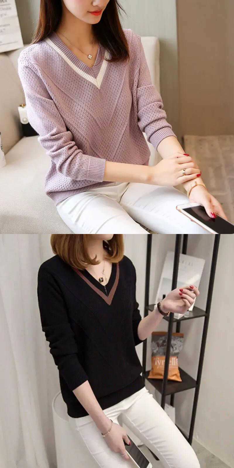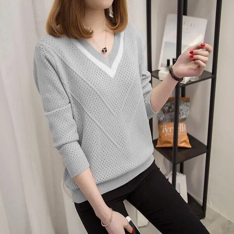 送料無料 スタイリッシュな V ネックニットスプライスオールマッチ中空アウトセーター女性の 2024 春プルオーバールーズトップス スプリング 春物 Vネック AE1288776611854158775
