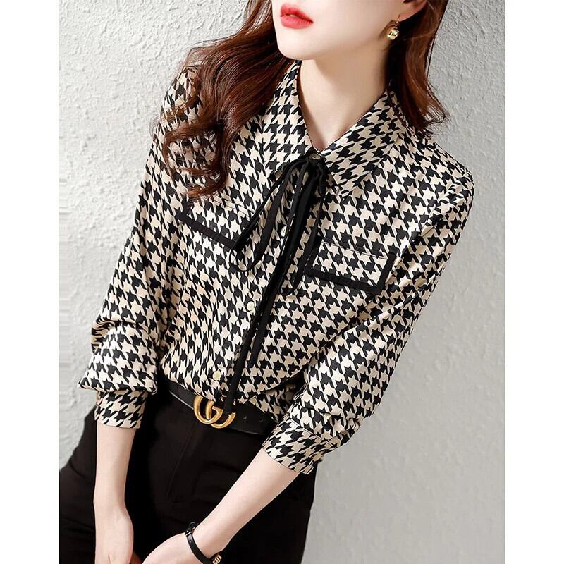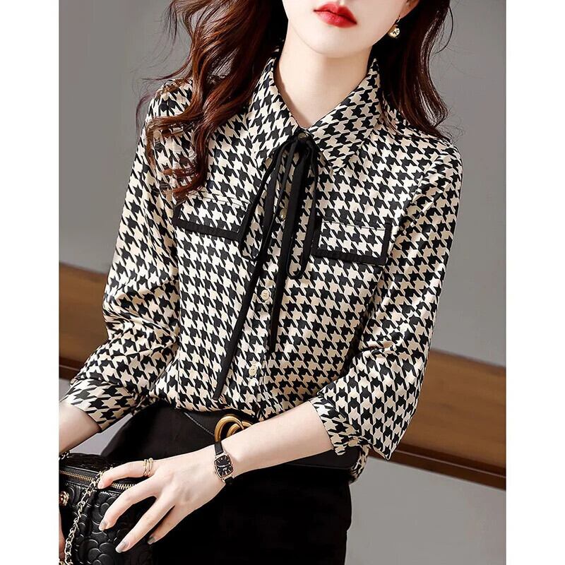 送料無料 プリントレースアップボウ千鳥格子シャツ 2023 秋冬ルーズトップスオフィスレディブラウス リボン オータム 秋物 ウィンター 冬物 会社 学校 通勤や通学にも AE1288776619356603817