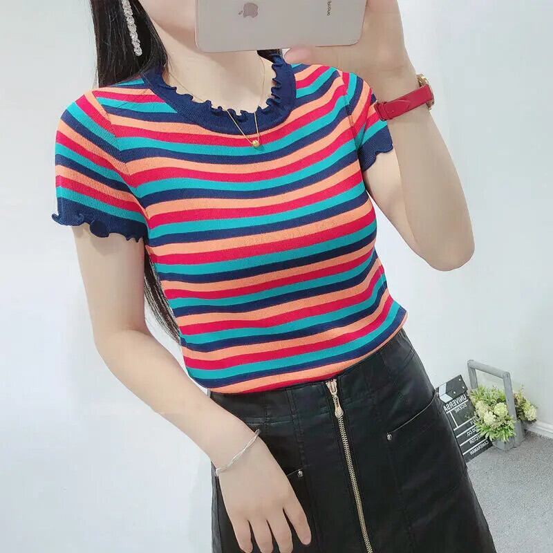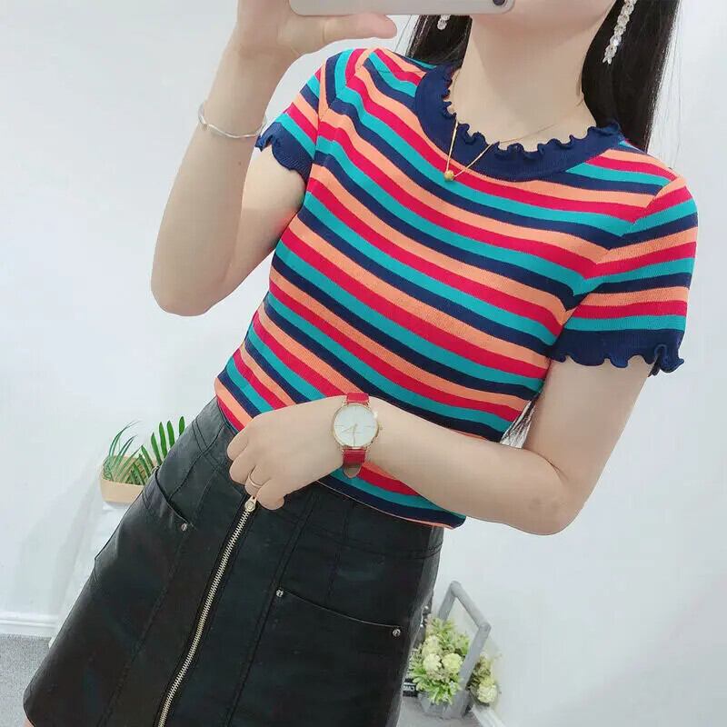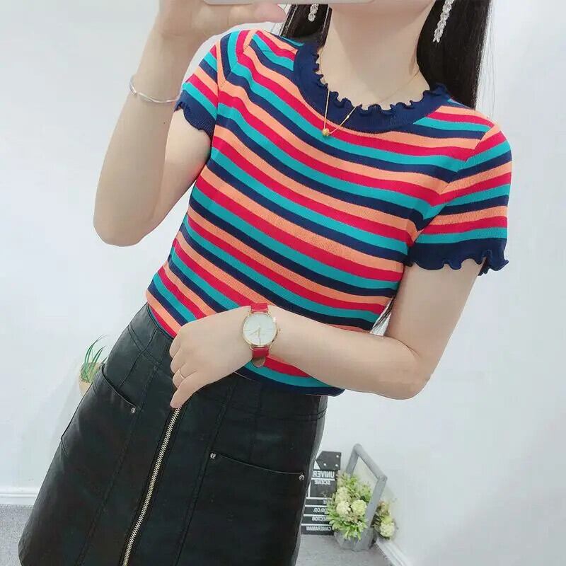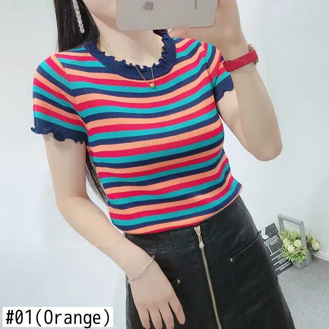送料無料 プリント O ネックスプライシングフリルストライプブラウス女性の 2023 夏プルオーバールーズシャツ ラッフル サマー 夏物 Oネック AE1288776693701686904