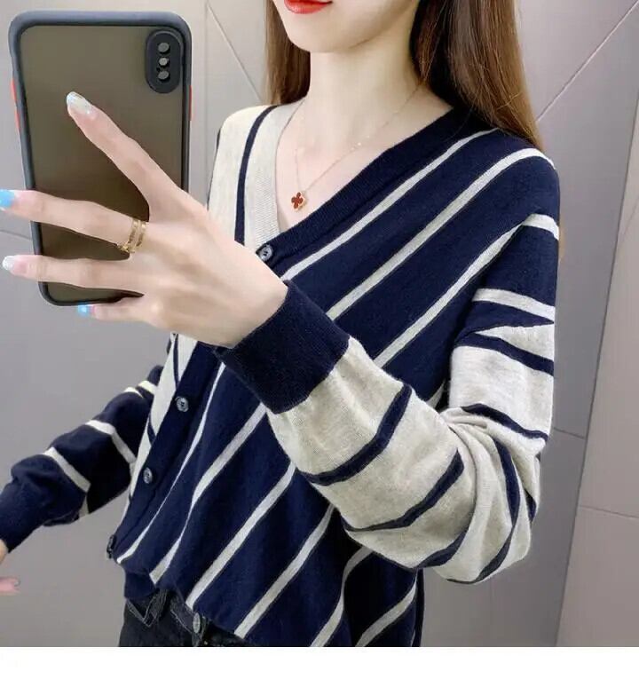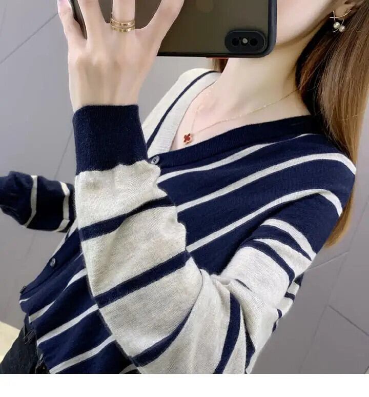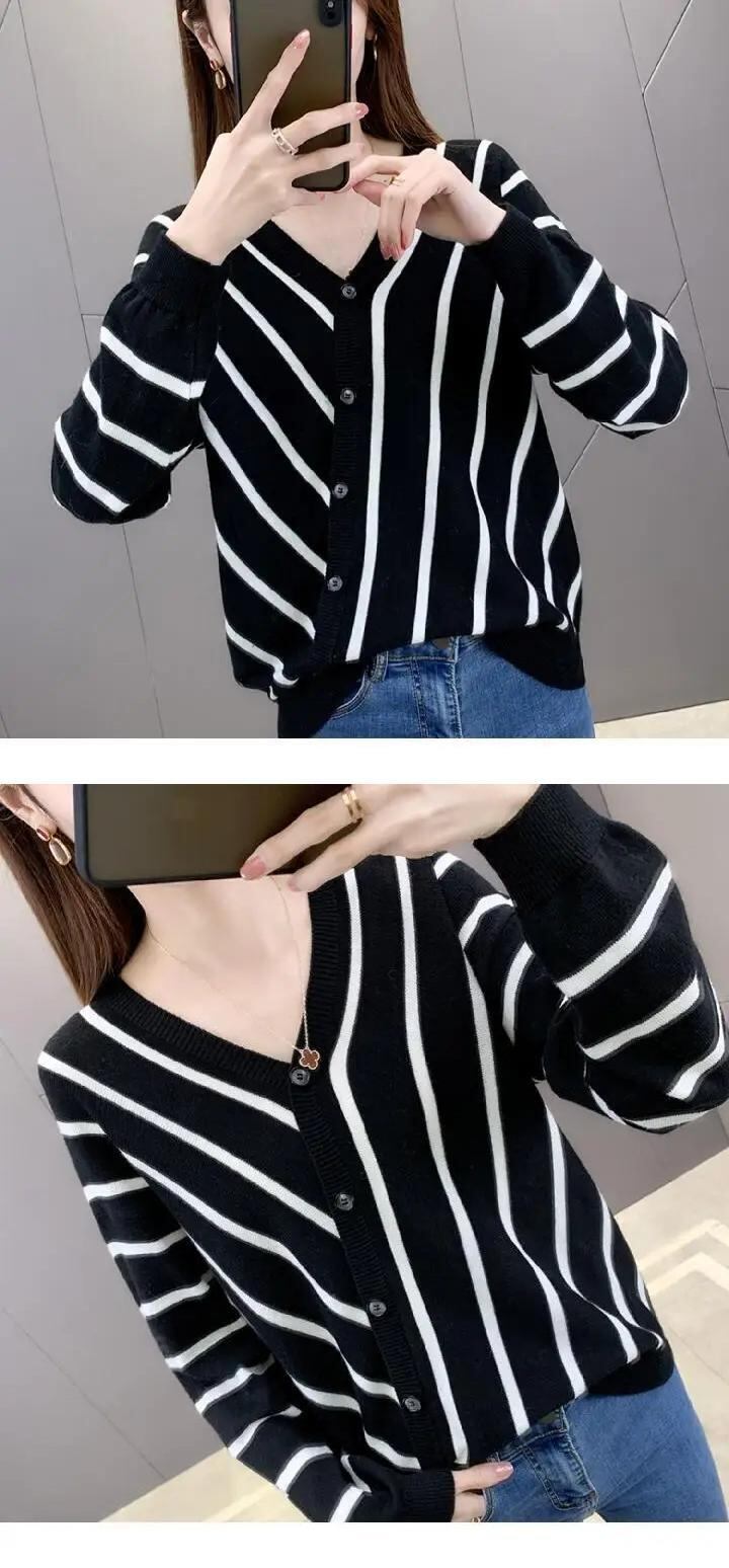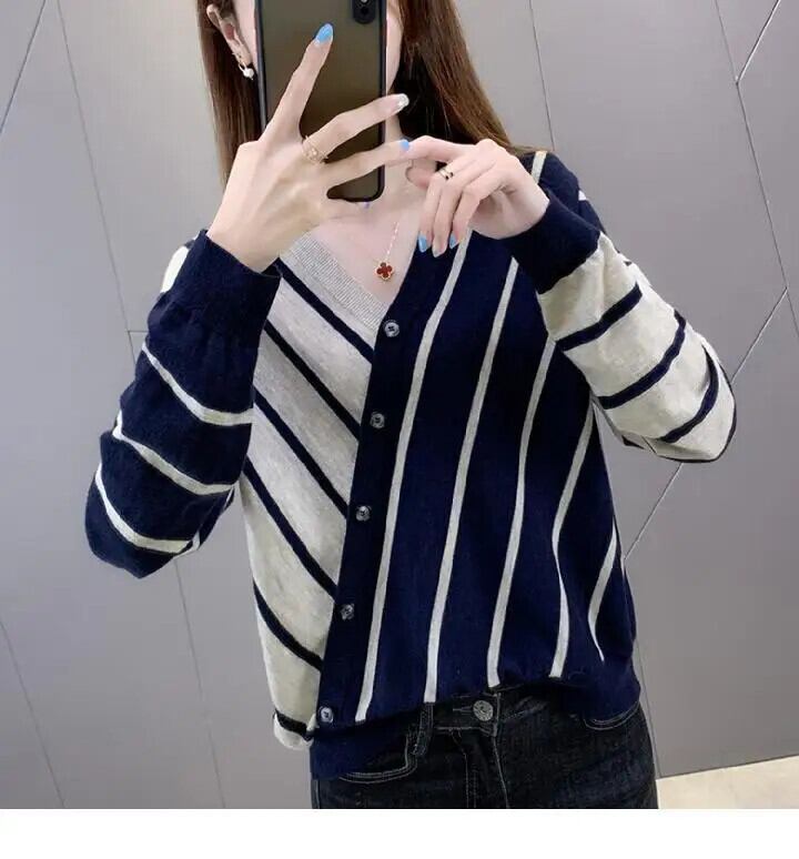 送料無料 Vネックボタン非対称ストライプニットシャツ2022秋トップスルーズ通勤ブラウス オータム 秋物 AE1288776684704676115